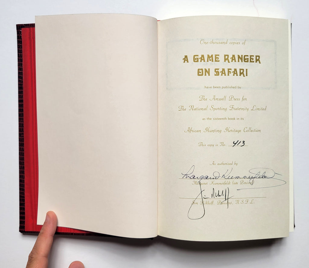 A.Blayney Percival, A Game Ranger’s Notebook and A Game Ranger on Safari. 2 volume set. Clinton, NJ: Amwell Press, 1985. Hardbound in bonded leather with slipcase. Xviii, 374; xviii, 305 pages. Illustrated, all edges gilt, silk endpapers, indices. Signed copies #413 of signed edition of 1000. Books very fine; slipcase fine. $200.
