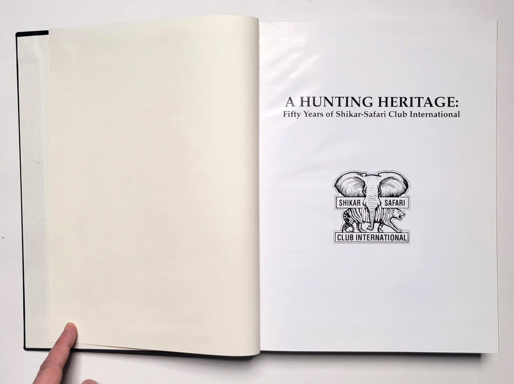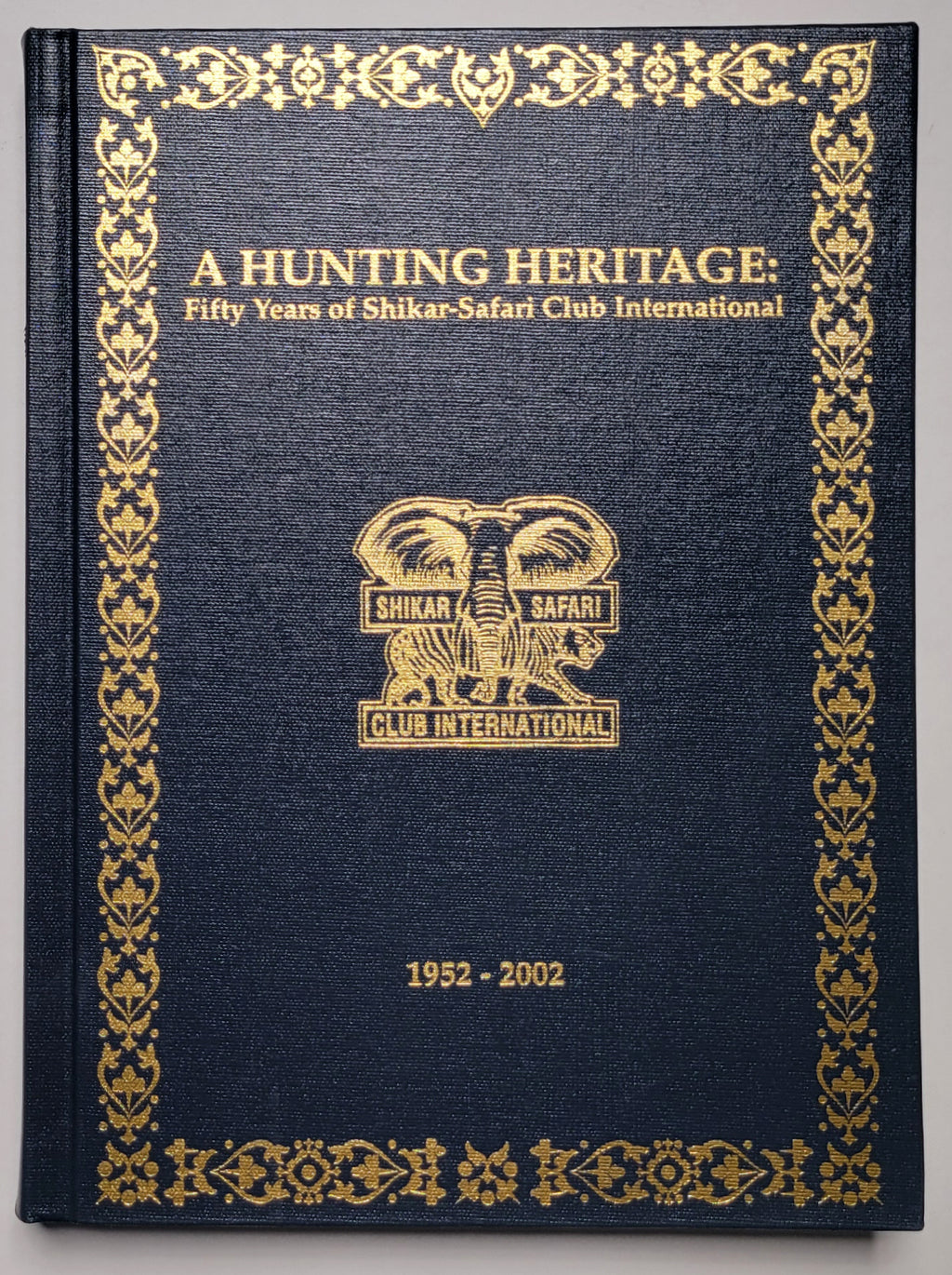 Andrew B. Phillips (Editor), A Hunting Heritage: Fifty Years of Shikar-Safari Club International, 1952-2002. No place given: Safari Club International, 2002. Hardbound (folio) size. viii, 597 pages. Illustrated. A massive compilation of dozens of stories by noted SCI members. Clearly a limited edition, since a sheet in the front carries the number 0875, but the limitation is not given (likely 1000). Very fine without slipcase, and it is likely the book was issued without one. $150.