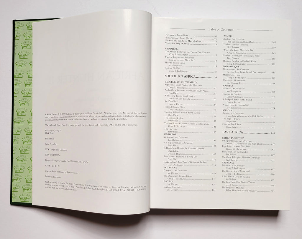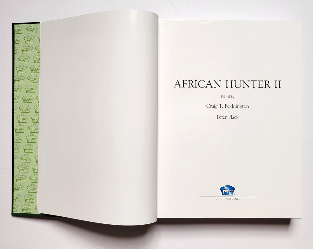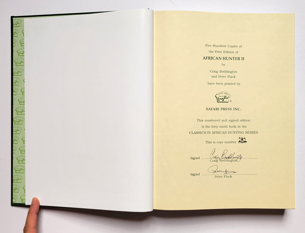 Craig Boddington and Peter Flack (Editors), African Hunter II. Long Beach, CA: Safari Press, 2004. Hardbound (large format)  in covered boards slipcase. x, 605 pages. Illustrated, index. Signed (by both editors) copy #282 of an edition of 500. Book and slipcase very fine. $300.