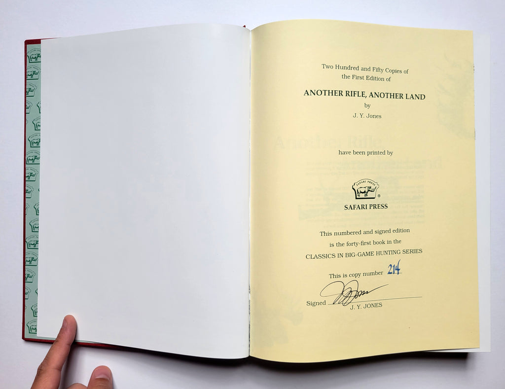 J. Y. Jones, Another Rifle, Another Land. Long Beach, CA: Safari Press, 2013. Hardbound (large format) in slipcase. Xx, 576 pages. Illustrated, bibliography. Signed copy #214 of 250 copies. Book and slipcase very fine. $150.
