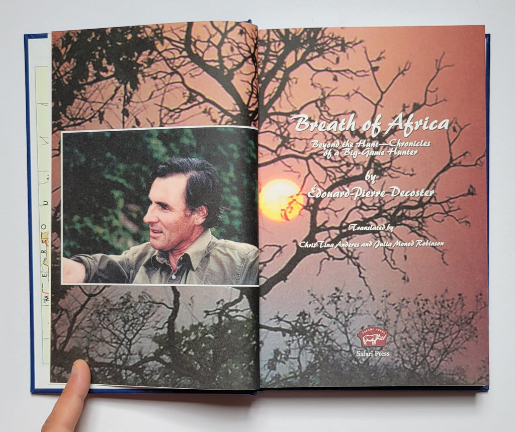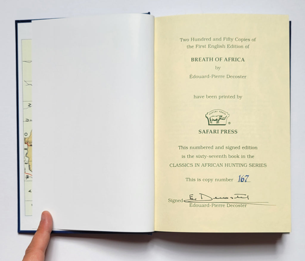 Edouard-Pierre Decoster, Breath of Africa: Beyond the Hunt—Chronicles of a Big-Game Hunter. Long Beach, CA: Safari Press, 2010. 1st U. S. edition. Hardbound in covered board slipcase with gold imprinting. Xx, 202 pages. Lavishly illustrated. Signed copy #167 of a limited edition of 250. Book and slipcase very fine.  A gem and given the limitation, obviously rare. $500.
