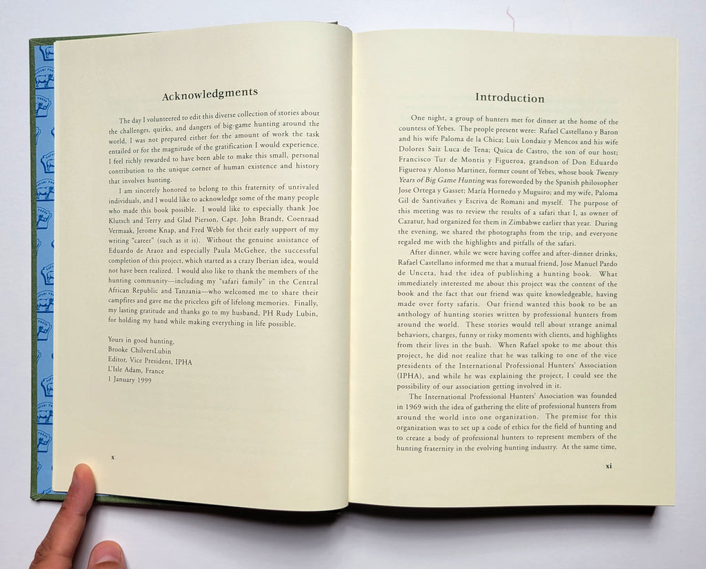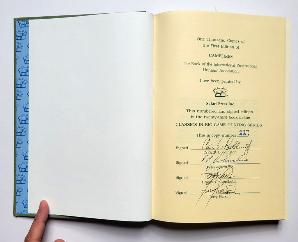 Brooke ChilversLubin (Editor), Campfires: The Book of the International Professional Hunters ‘ Association. Long Beach, CA: Safari Press, 2003. Hardbound in slipcase. Copy #227 of an edition of 1000. Signed (two signature pages) by eight of the contributors. There are 39 chapters spanning big-game hunting across the globe with many heralded names among the writers. Illustrated. Book and slipcase fine. $80.