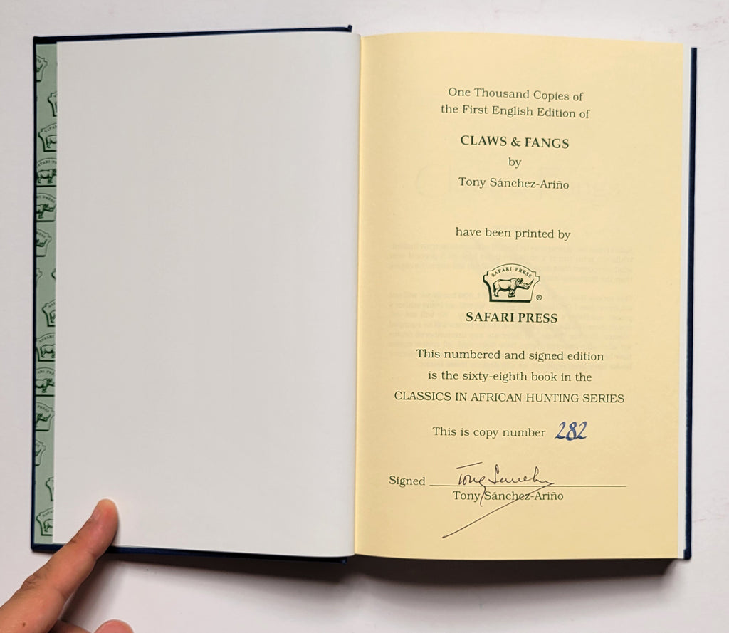 Tony Sanchez-Arino, Claws & Fangs. Long Beach, CA: Safari Press, 2011. Hardbound if covered boards slipcase. xviii, 332 pages. Illustrated. Signed coy #282 of an edition of 1000. Book and slipcase very fine. $140.