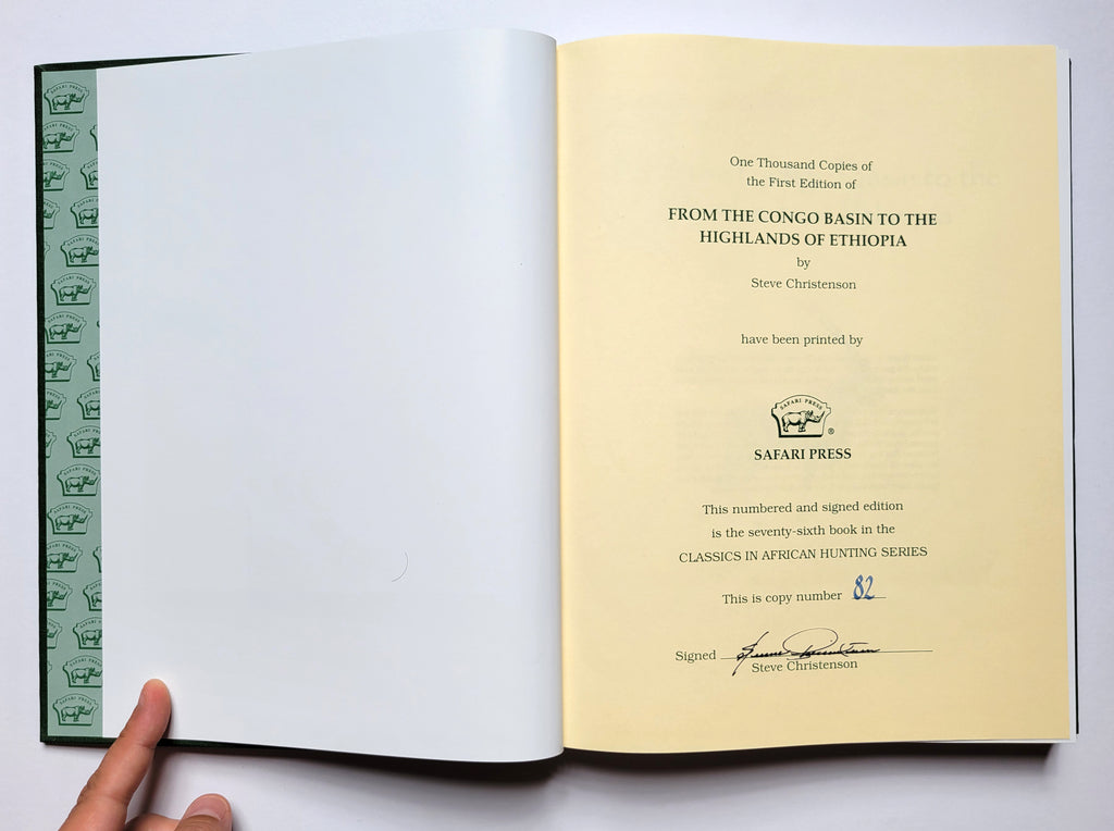 Steve Christenson, From the Congo Basin to the Highlands of Ethiopia. Long Beach, CA: Safari Press.. Hardbound (large format) in slipcase. Illustrated. Signed copy #82 of an edition of 1000. Book and slipcase very fine. $250.