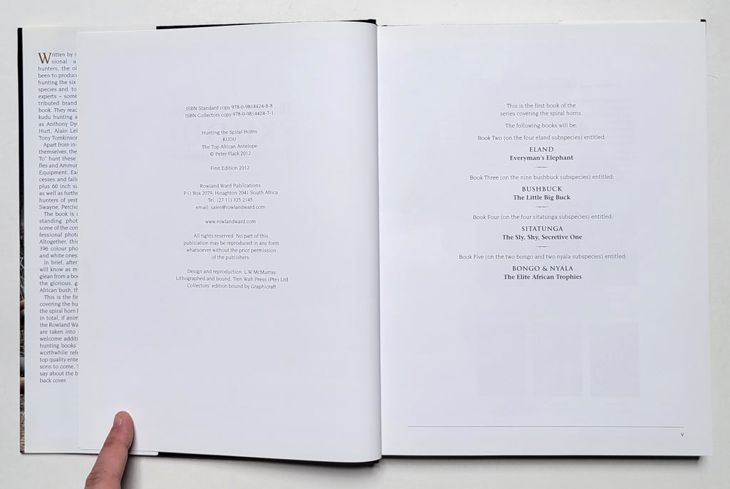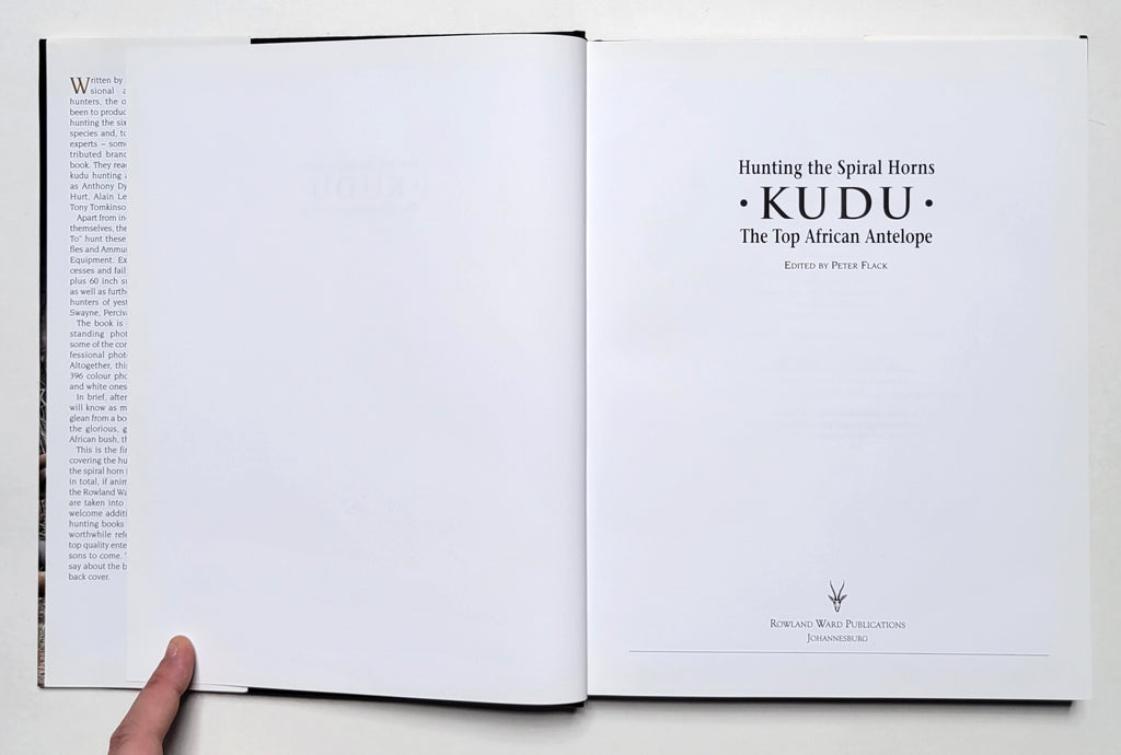 Peter Flack (Editor), Hunting the Spiral Horns: Kudu—The Top African Antelope. Johannesburg, South Africa: Rowland Ward Publications, 2012. Hardbound in dust jacket. xiv, 278 pages. Lavishly illustrated. Large format. Book and dust jacket very fine. Extremely rare and missing from most collections. $750.
