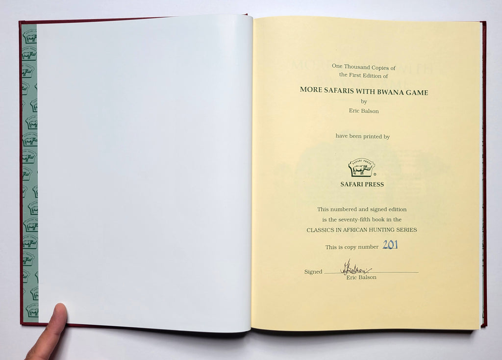 Eric Balson, More Safaris with Bwana Game. Long Beach, CA: Safari Press, 2013. Hardbound in slipcase. Xii, 228 pages. Illustrated. Signed copy #201 of an edition of 1000. Book and slipcase very fine. $150.