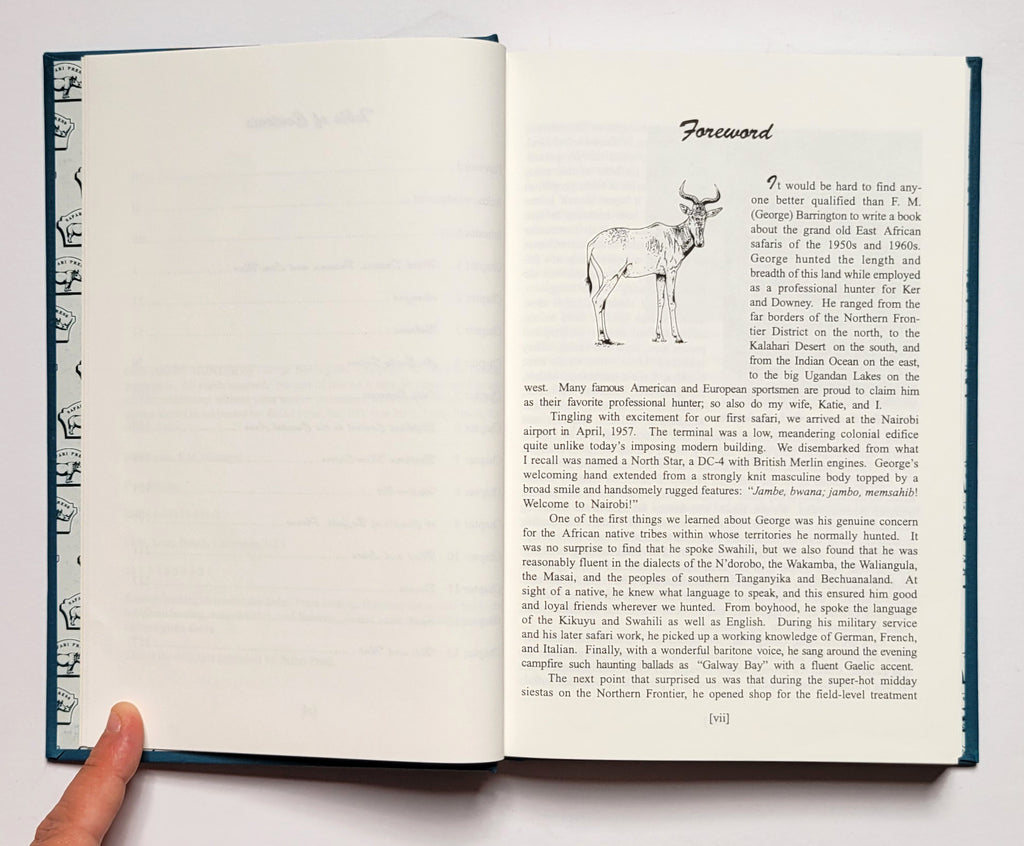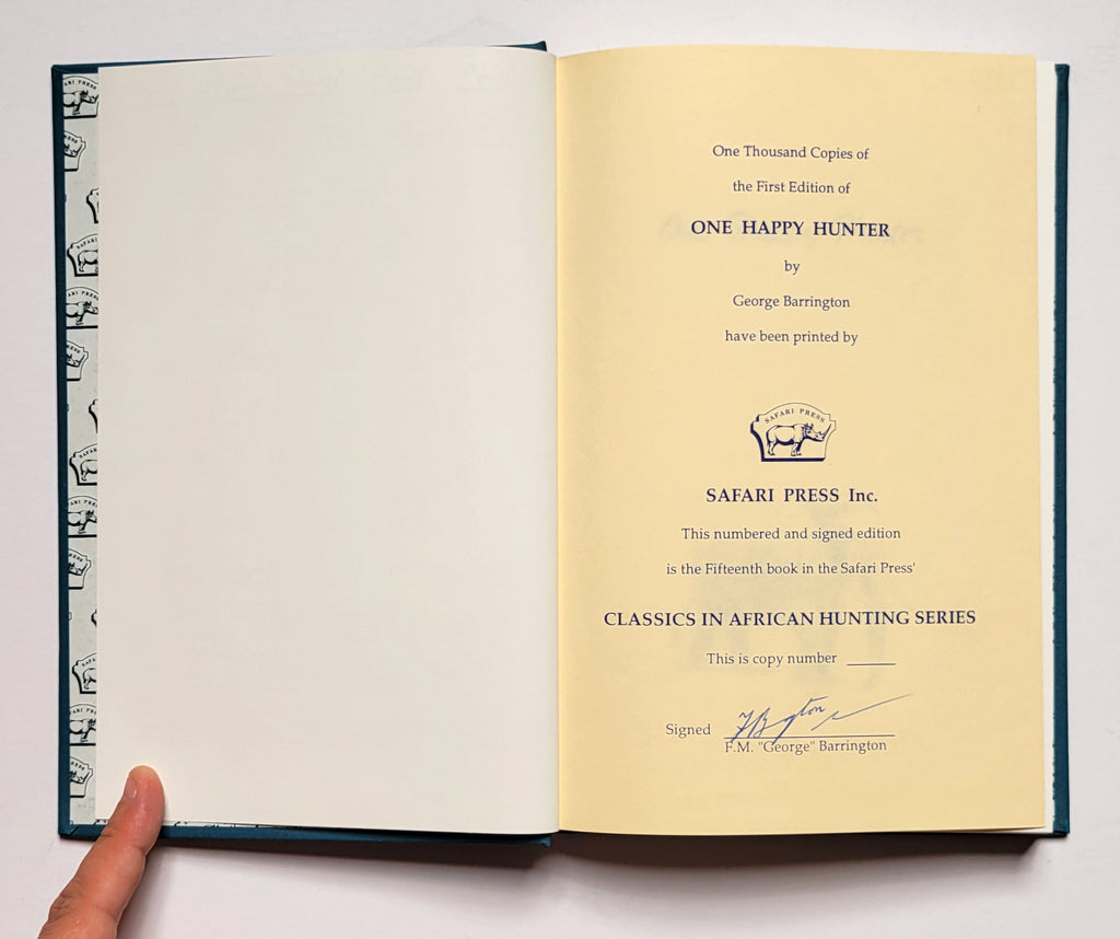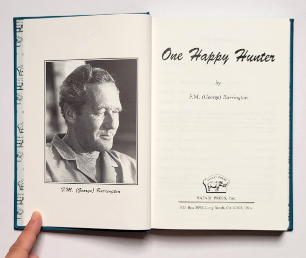 F. M. Barrington, One Happy Hunter. Long Beach, CA: Safari Press, 1994. Hardbound in covered boards slipcase. Xxii, 274 pages. Illustrated. Signed but unnumbered copy of an edition of 1000. Book and slipcase very fine. $125.