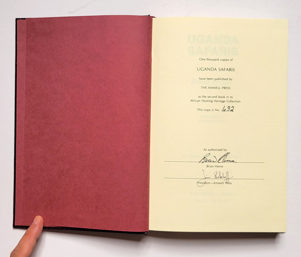 Brian Herne, Uganda Safaris (with a Foreword by Anthony Dyer). Clinton, NJ: Amwell Press, 1979. Hardbound in slipcase. Xx, 236 pages. Illustrated. Signed copy #632 of an edition of 1000. Book and slipcase fine. $150.