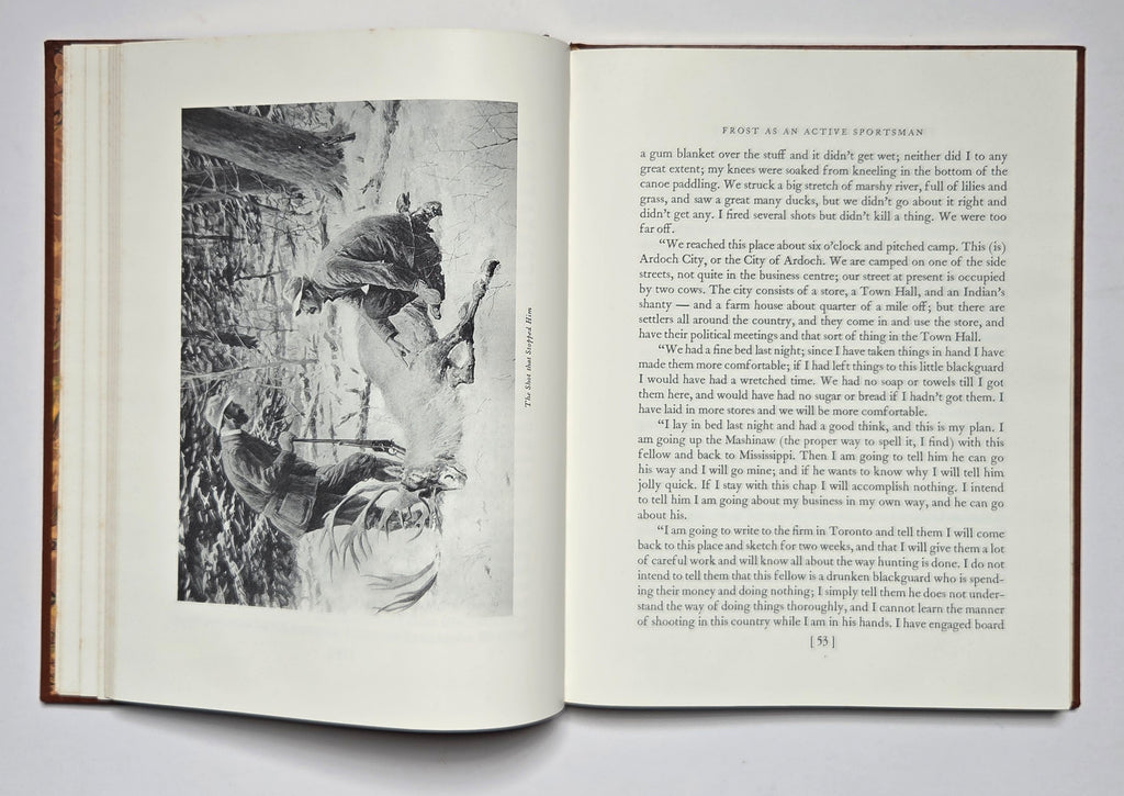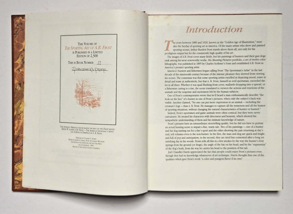 Arthur Burdett Frost, The Sporting Art of Arthur Burdett Frost edited by James Casada and Charles Wechsler). Leatherbound (large format). Title notwithstanding, this is actually a reprint of Henry Wysham Lanier’s A. B. Frost: The American Sportsman’s Artist and Frost’s A Book of Drawings, with a new Introduction by Peggy Robbins. Columbia, SC: Live Oak Press, 1994.  Copy #650 of an edition of 2300 in the Sporting Heritage Series. Signed by Casada. All edges gilt, raised hubs on spine, ribbon marker, marbled endpapers, gilt decoration to front cover and spine. Minor foxing throughout. $35.