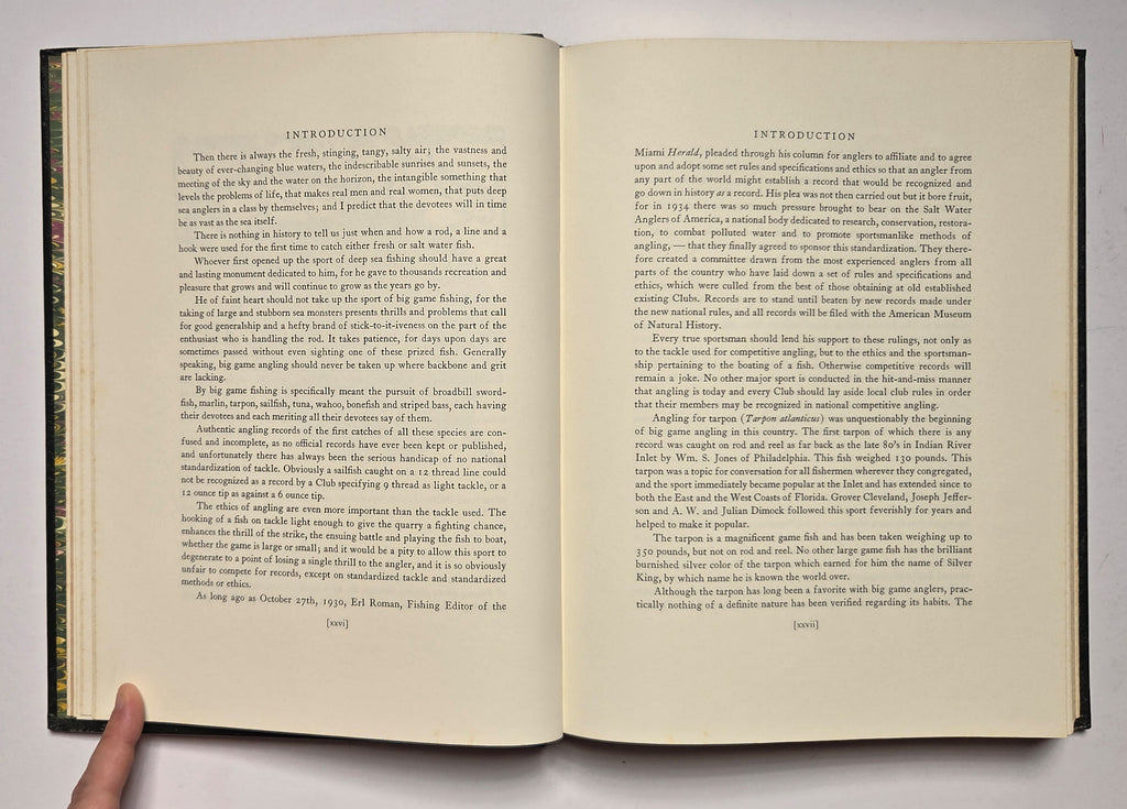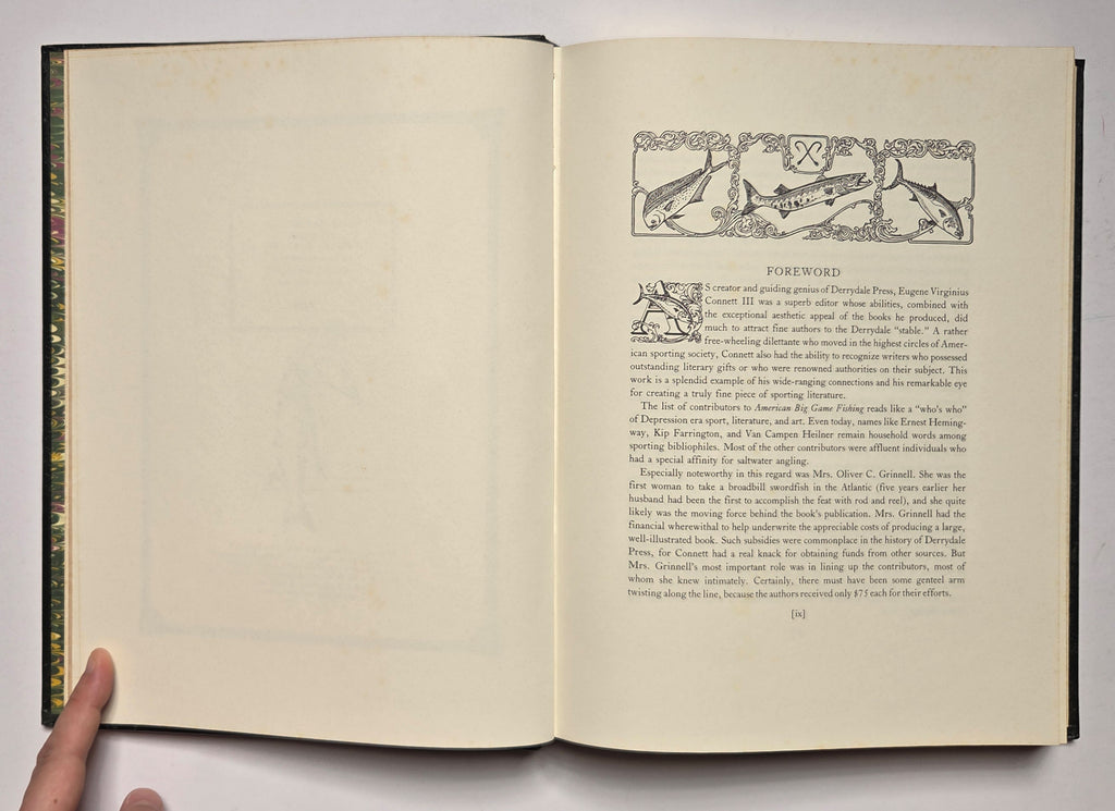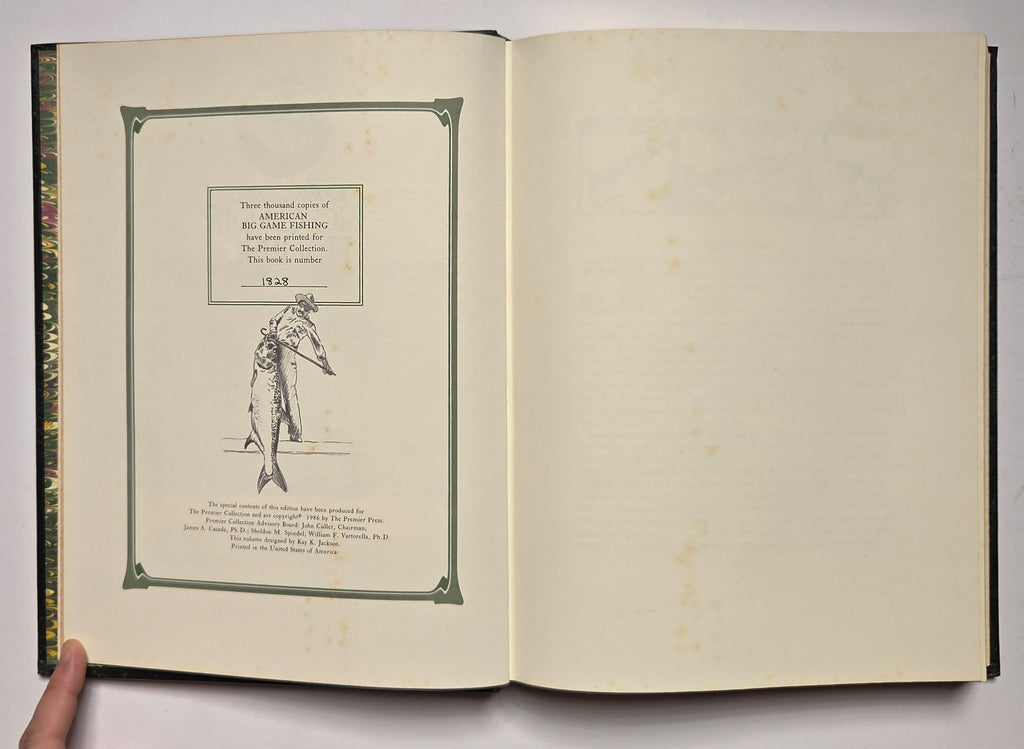 Eugene V. Connett, American Big Game Fishing. USA: The PremierCollection, 1986. 292 pages. Hardbound. Illustrated. Limited edition, number 1828 of 3000 copies printed. Leather boards with gilt decor. Foxing visible on several pages. $25