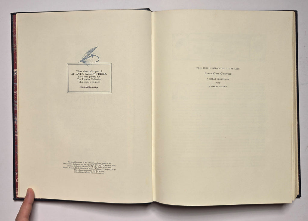 Charles Phair, Atlantic Salmon Fishing. USA: The Premier Collection, 1985. 219 pages. Hardbound. Illustrated. Press proof #5 of 3000 copies printed. Leather boards with gilt decor. Binding tight. $60