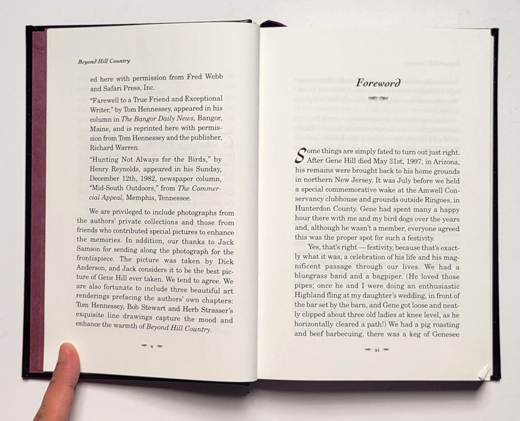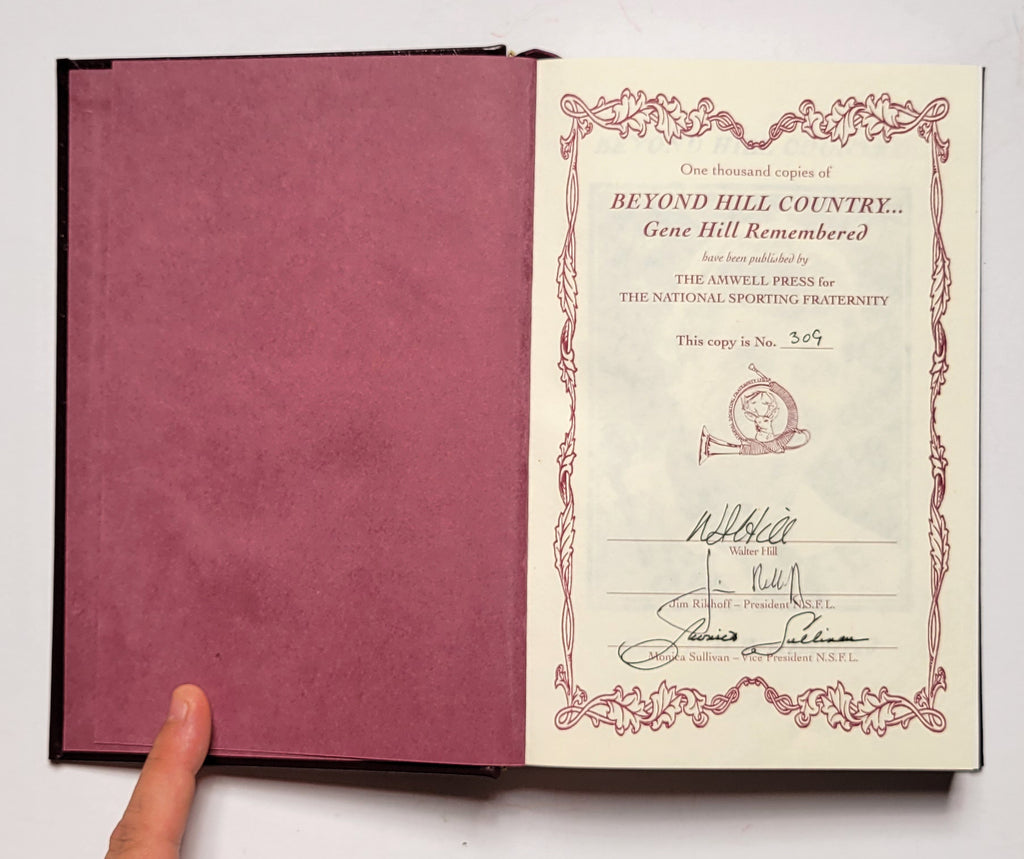 Jim Rikhoff and Monica Sullivan (Editors), Beyond Hill Country: Gene Hill Remembered. Bonded leather in boards slipcase. Clinton, NJ: Amwell Press, 2004. Xxxvi, 262 pages. Signed (by editors) copy #309 of 1000. Illustrated, gilt decoration to front and spine, ribbon marker. Book and slipcase very fine. $130.