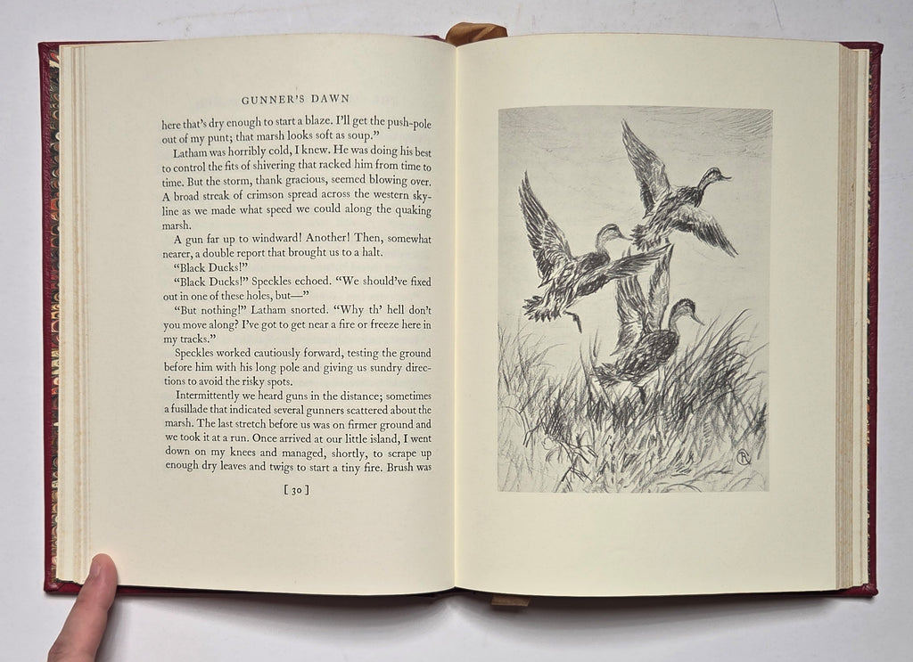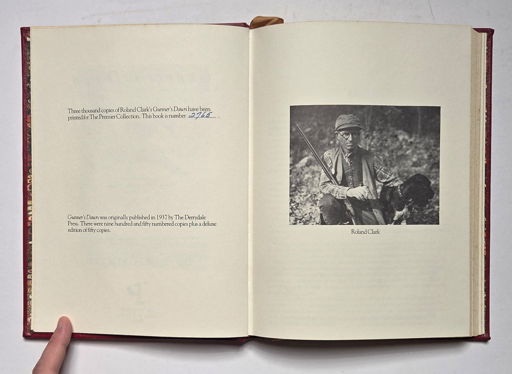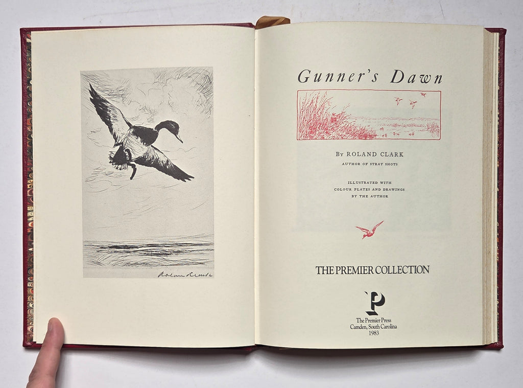 Roland Clark, Gunner’s Dawn. Camden, SC: The Premier Collection, 1983. Hardbound in leather. [xii], 125 pages. New Foreword by Paul Rundell. Copy #2765 of 3000. Gold imprinting, all edges gilt, ribbon marker, marbled endpapers, raised hubs. Fine. $45.