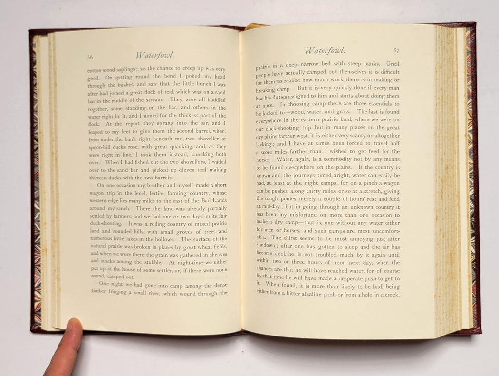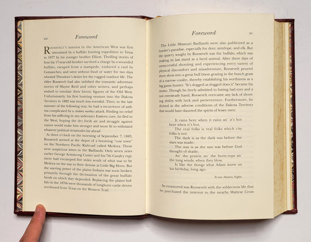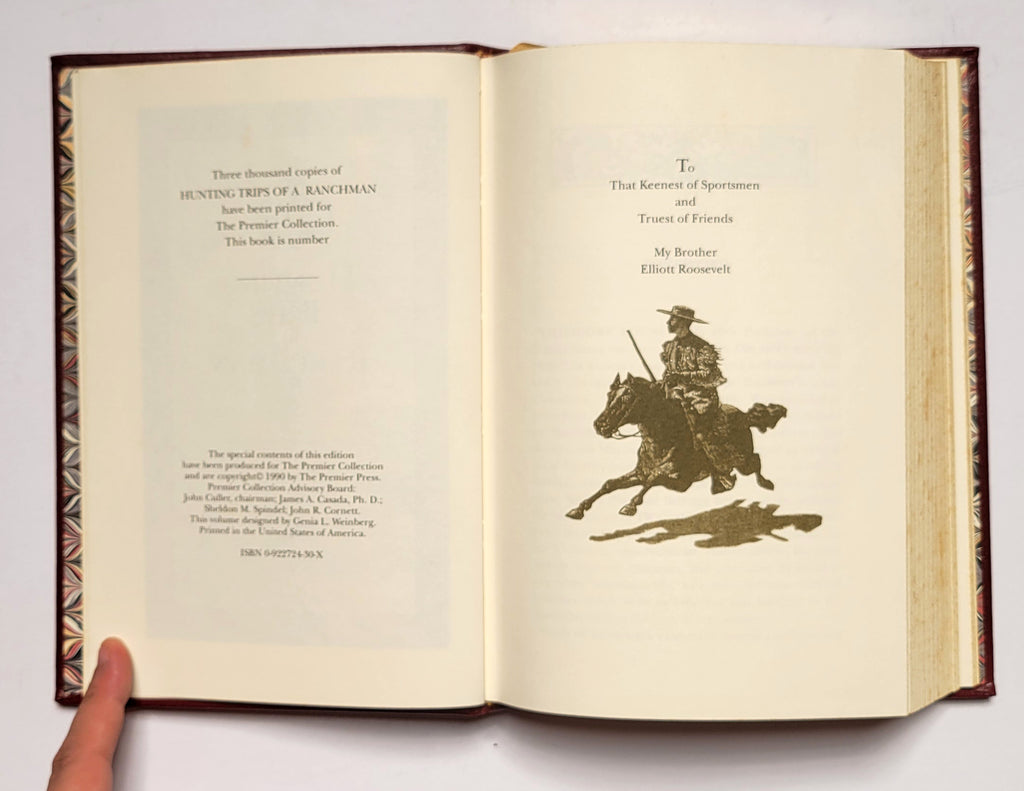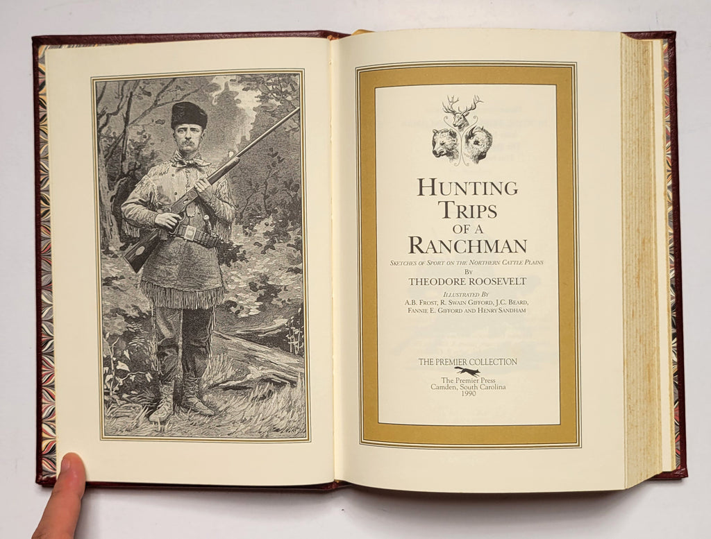 Theodore Roosevelt, Hunting Trips of a Ranchman. Camden, SC: The Premier Press, 1990. Hardbound in leather. Unnumbered copy of a stated limited edition of 3000. Bound in bonded leather, with raised hubs, gold imprinting, all edges gilt, marbled endpapers, and ribbon marker.  Minor foxing on edges. $40.