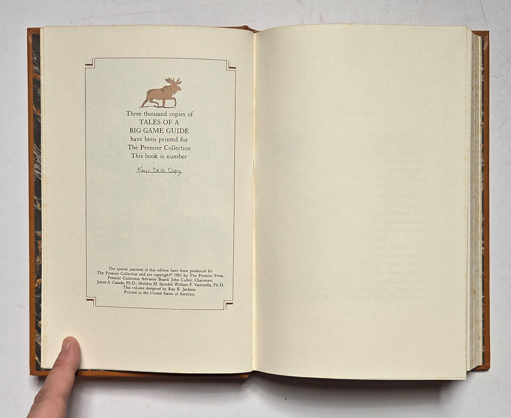 Russell Annabel, Tales of a Big Game Guide (With a Foreword by Ellen Enzler-Herrin). Leatherbound. Camden, SC: Premier Press, 1985. Xxx, 218 pages. Illustrated, all edges gilt, ribbon marker, raised hubs on spine, marbled endpapers. Limited edition of 3000. Very fine. $45.