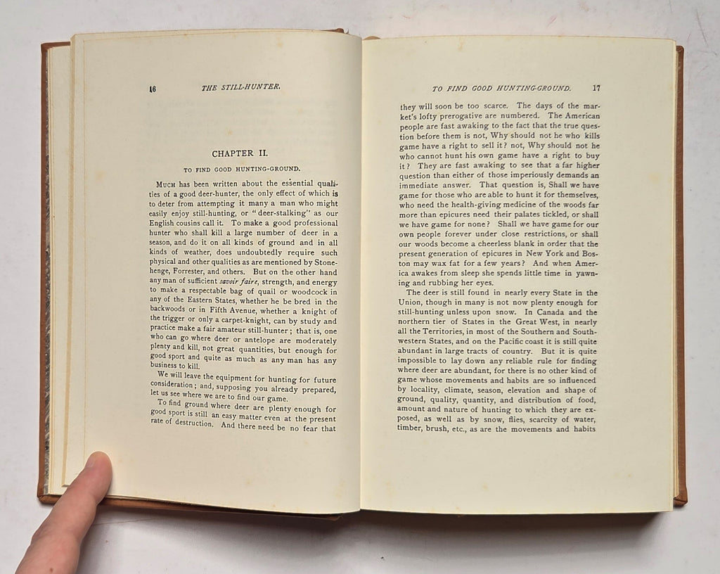 Theodore Van Dyke, The Still-Hunter. Camden, SC: Premier Press, 1988. Leather bound. Limited edition of 3000 copies, with a new Foreword by Rob Wegner. Raised hubs, all edges gilt, ribbon marker, etc. Scattered foxing throughout. $55.