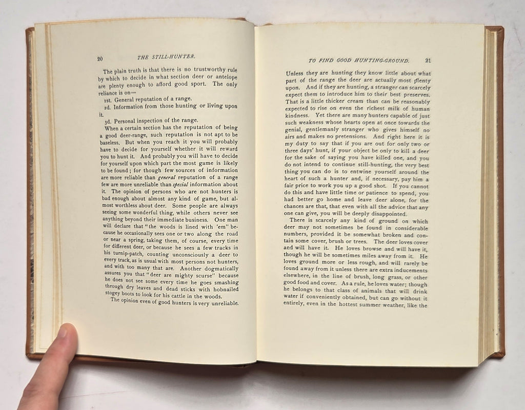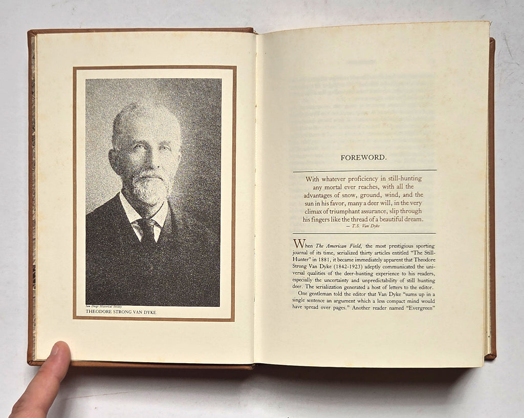 Theodore Van Dyke, The Still-Hunter. Camden, SC: Premier Press, 1988. Leather bound. Limited edition of 3000 copies, with a new Foreword by Rob Wegner. Raised hubs, all edges gilt, ribbon marker, etc. Scattered foxing throughout. $55.