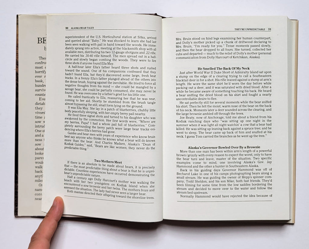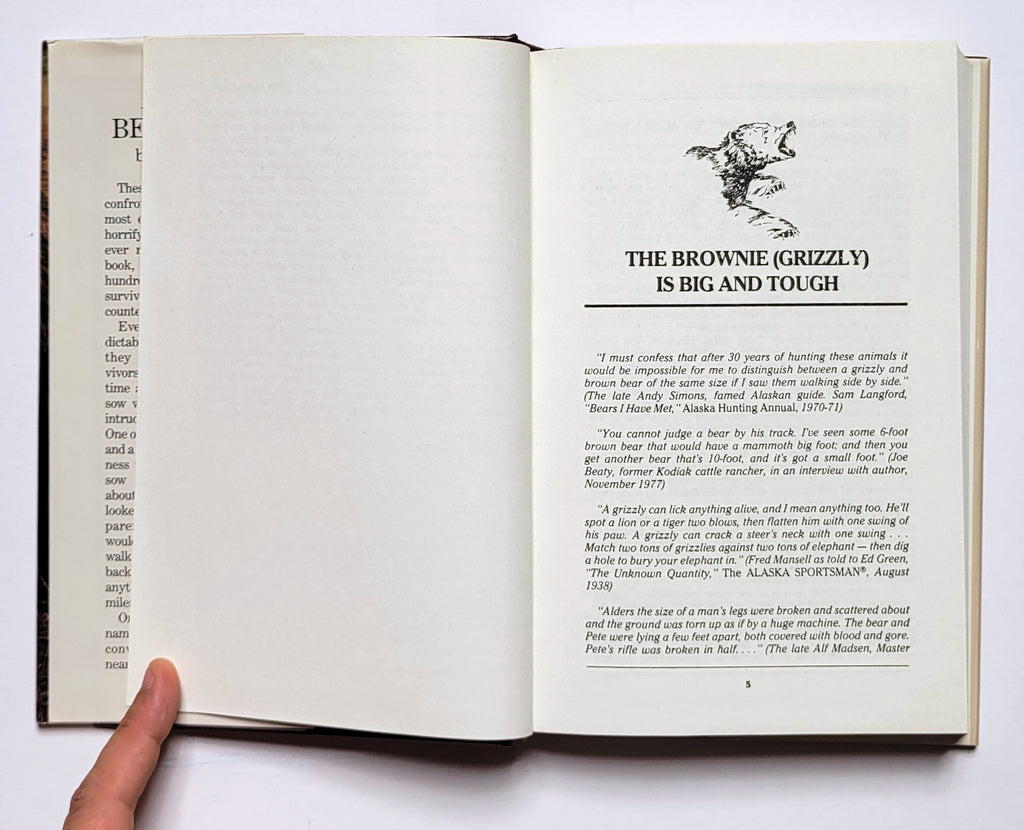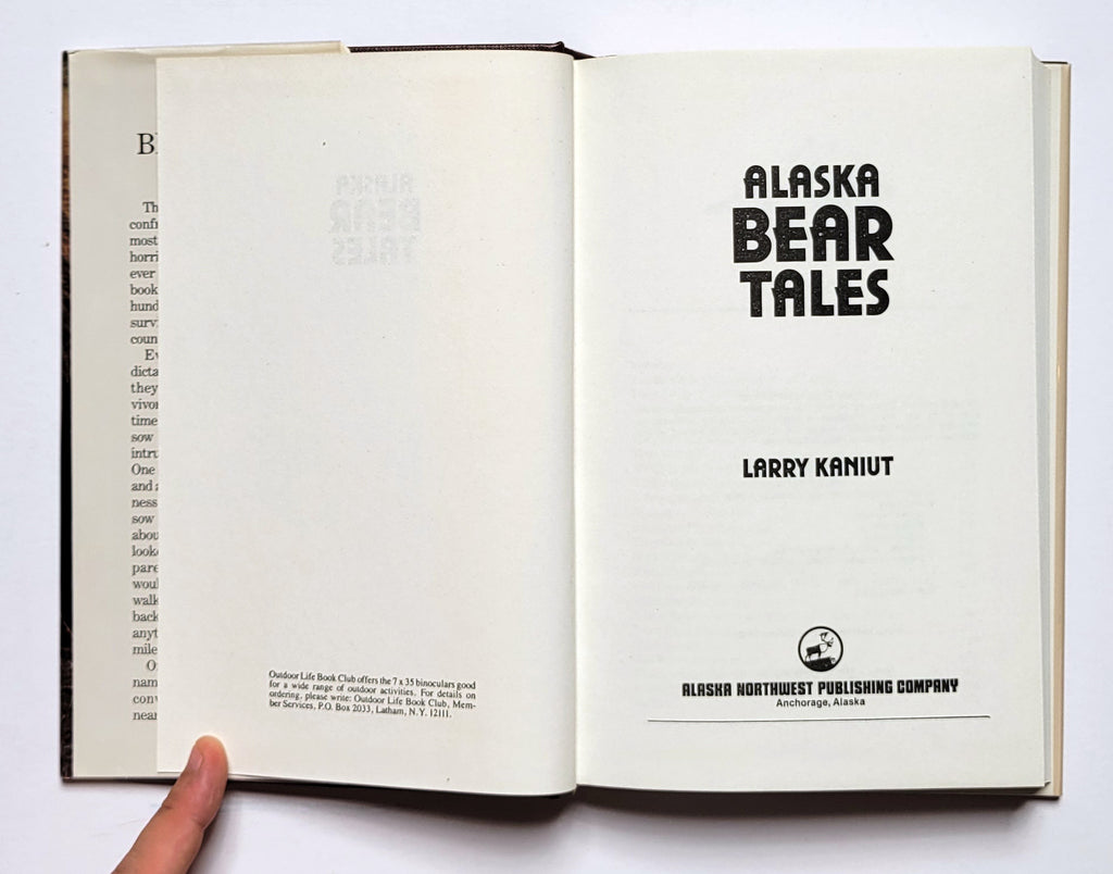 Larry Kaniut, Alaska Bear Tales. Hardbound in glassine-protected dust jacket. Anchorage: Alaska Northwest Publishing, 1983. Vi, 318 pages. Bibliography, index. Book and dust jacket very fine. Unusual in hardbound form. $40.