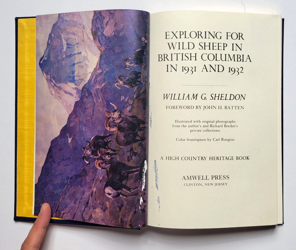 William G. Sheldon, Exploring for Wild Sheep in British Columbia in 1931 and 1932. Clinton, NJ: Amwell Press, 1981. Leatherbound in sloth slipcase. Xxiv, 246 pages. Illustrated. Signed copy #100 of an edition of 1000. Book very fine; slipcase fair. $100.