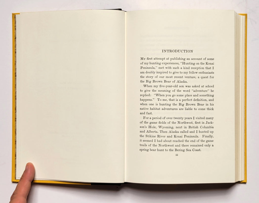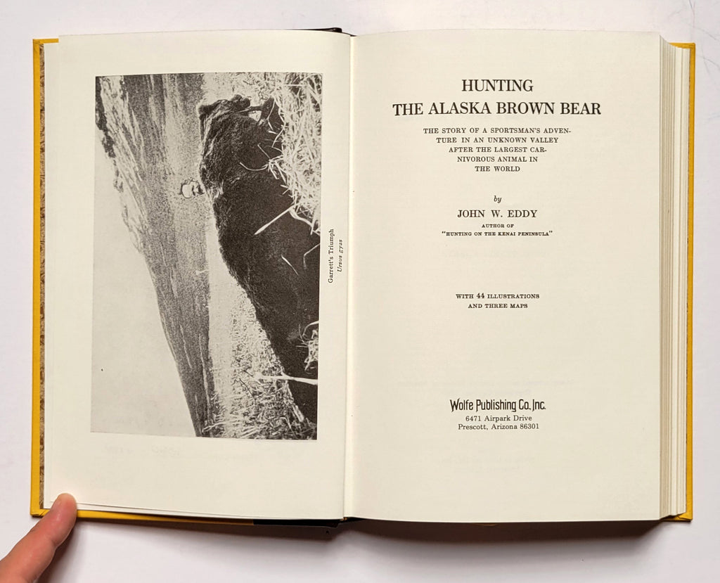 John W. Eddy, Hunting the Alaska Brown Bear. Hardbound in quarter leather. Prescott, AZ: Wolfe Publishing, 1988 (a reprint of the 1930 original). Xvi, 252 pages. Illustrated, maps. Copy #1020 of an edition of 1500. Good (discoloration (probably from contact with the leather of other copies) to the buckram portion of the book. Ribbon marker, all edges gilt, raised hubs on spine, marbled endpapers. $85.