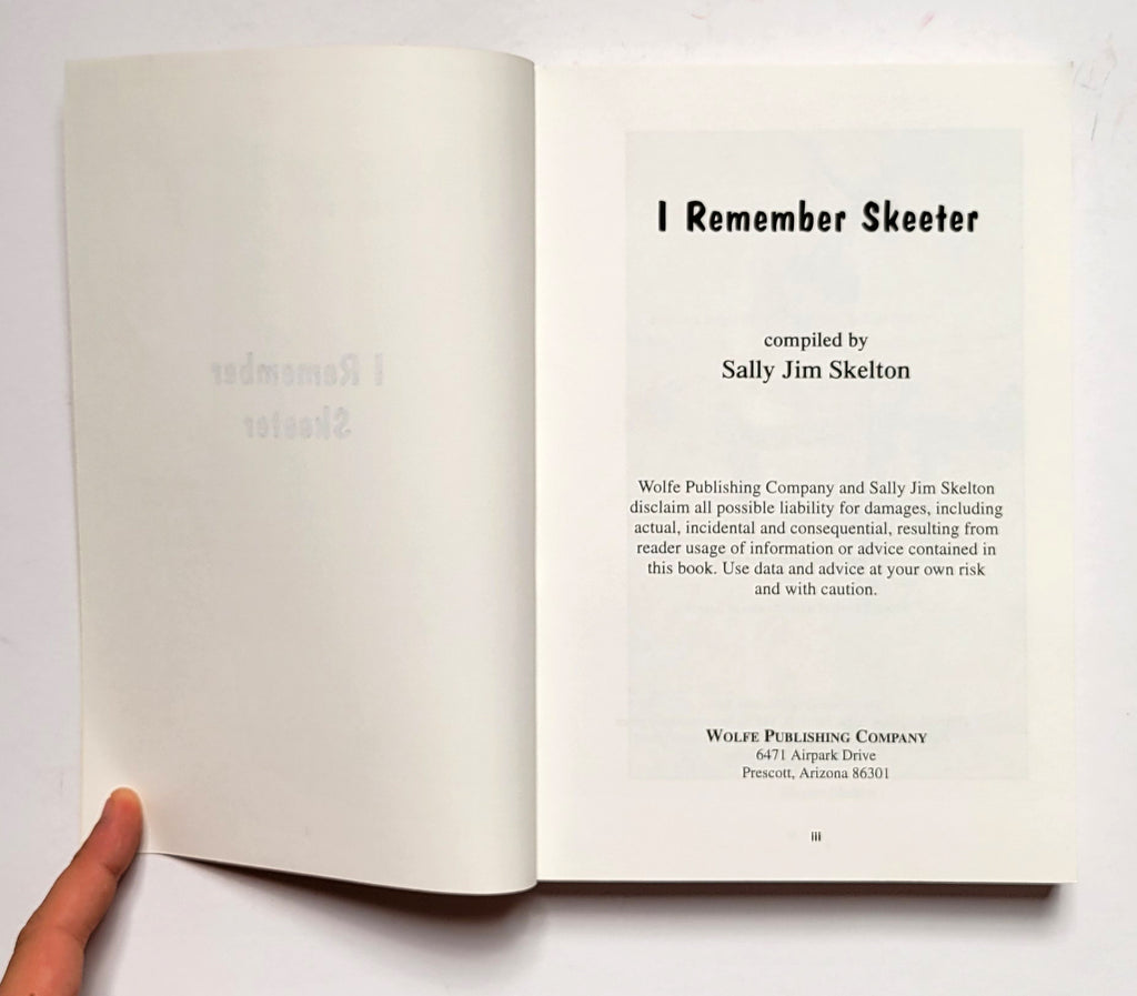 Sally Jim Skelton (Compiler), I Remember Skeeter. Prescott, AZ: Wolfe Publishing, 1997. Paperbound. xiv, 401 pages. Illustrated. Very good. Obscure to rare. $110.