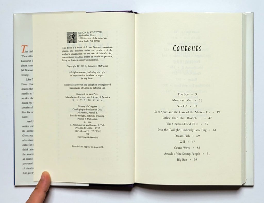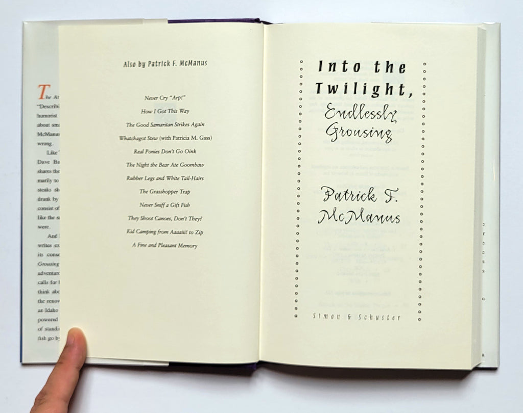 Patrick McManus, Into the twilight, Endlessly Grousing. Hardbound in glassine-protected dust jacket. NY: Simon & Schuster, 1997. 221 pages. Book and dust jacket very fine. $8.