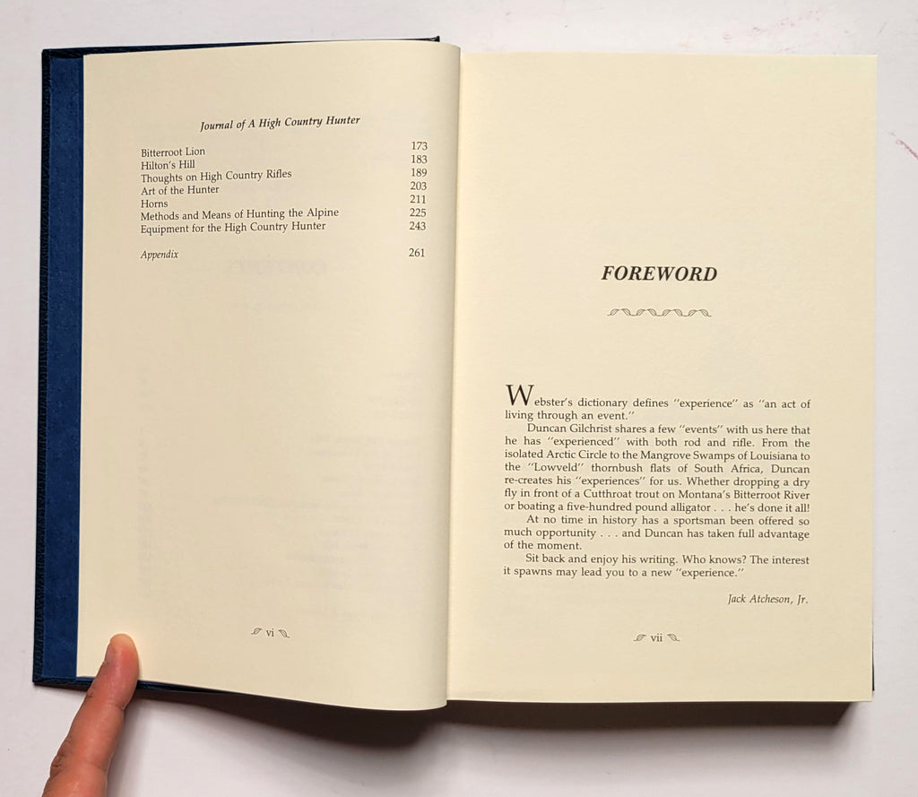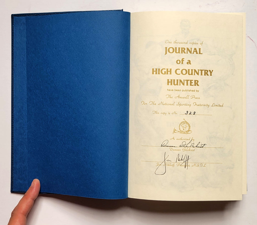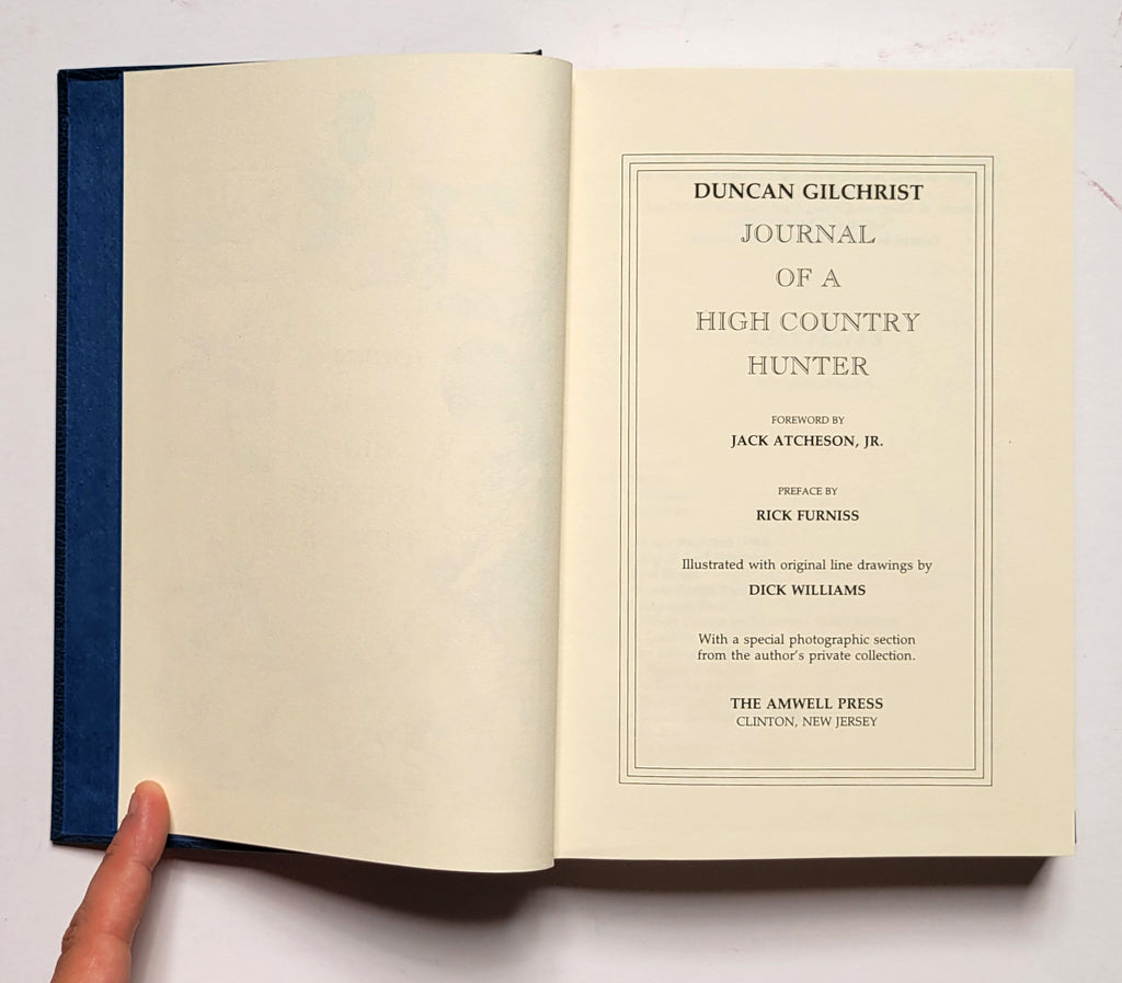 Duncan Gilchrist, Journal of a High Country Hunter (Foreword by Jack Atcheson, Jr.). Clinton, NJ: Amwell Press, 1992. Hardbound in bonded leather with  covered board slipcase. Xviii, 365 pages. Illustrated, ribbon marker, brochure tipped in. Signed (by author and publisher) copy #328 of 1000. Book very fine; slipcase about fine. $150.