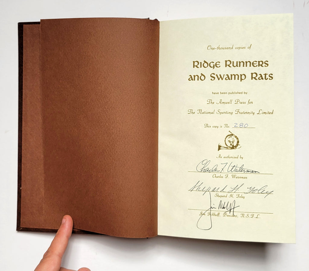 Charles F. Waterman, Ridge Runners and Swamp Rats (with a Foreword by Charley Dickey and art by Shep Foley). Hardbound in bonded leather with boards slipcase. Clinton, NJ: Amwell Press, 1983. Xiv, 347 pages. Signed copy #280 of a limited edition of 1000. Illustrated, ribbon marker. Book very fine and dust jacket fine. $70.