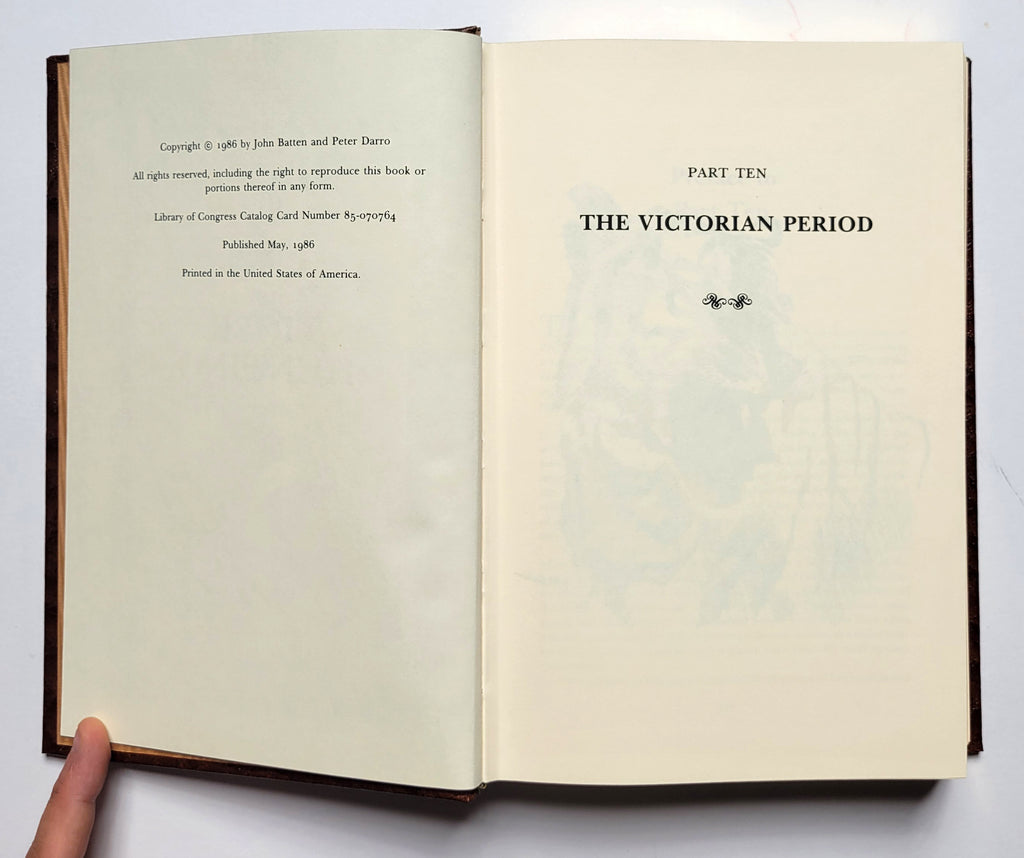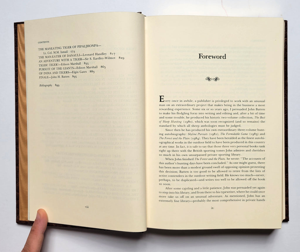 John Batten, The Best of Tiger Hunting. 2 volumes. Clinton, NJ: Amwell Press, 1986. Hardbound in mottled leather with a slipcase. xx, 431; 432-905 pages. Illustrated, bibliography, silk endpapers. Signed copies #328 of an edition of 1000. Books and slipcase near fine. $300.