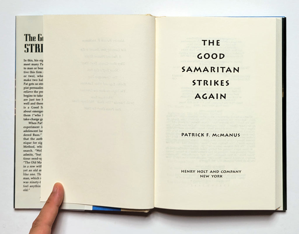 Patrick McManus, The Good Samaritan Strikes Again. Hardbound in glassine-protected dust jacket. NY: Henry Holt, 1992. X, 212 pages. 1st edition. Book and dust jacket very fine. $8.