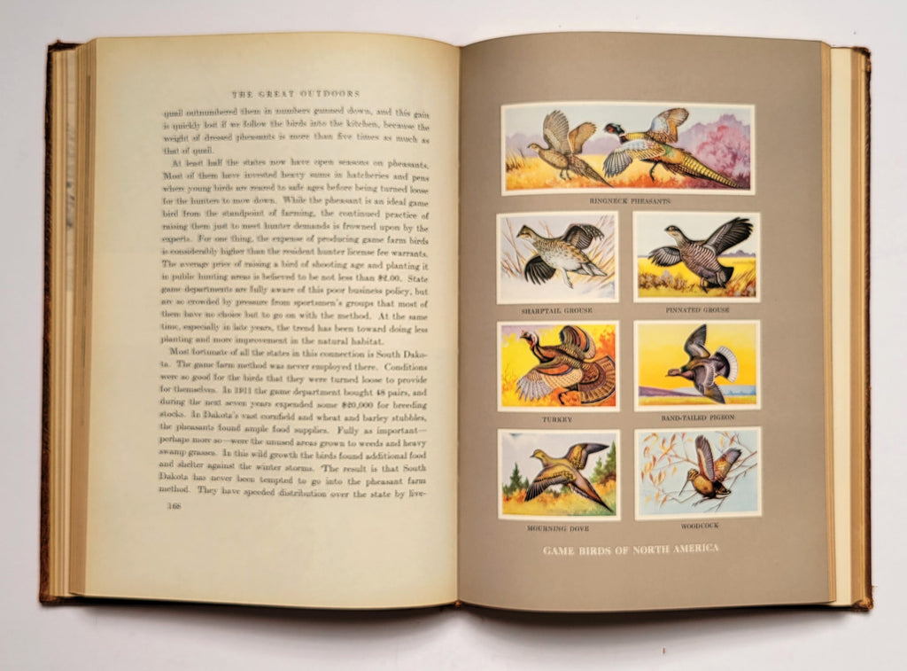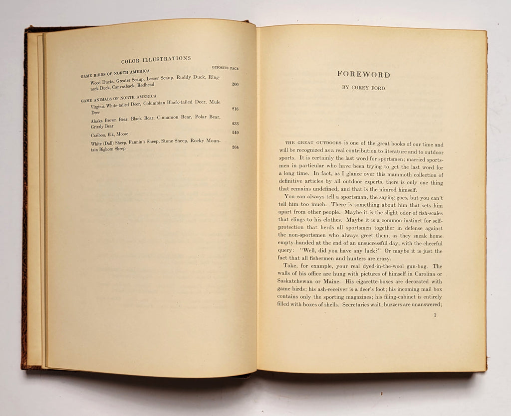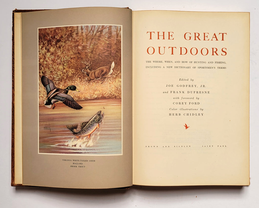 Joe Godfrey, Jr.  and Frank Dufresne (Editors), The Great Outdoors (with a Foreword by Corey Ford). St. Paul, MN: Brown and Bigelow, 1947. 1st edition. Bound in imprinted leather. [vi], 376 pages. Lavishly illustrated. A collection of stories from many of the “greats” of the era such as Buckingham, Sheldon, and Wulff. All edges gilt. Fair plus copy (top and bottom of spine worn) of a lovely book. $14.