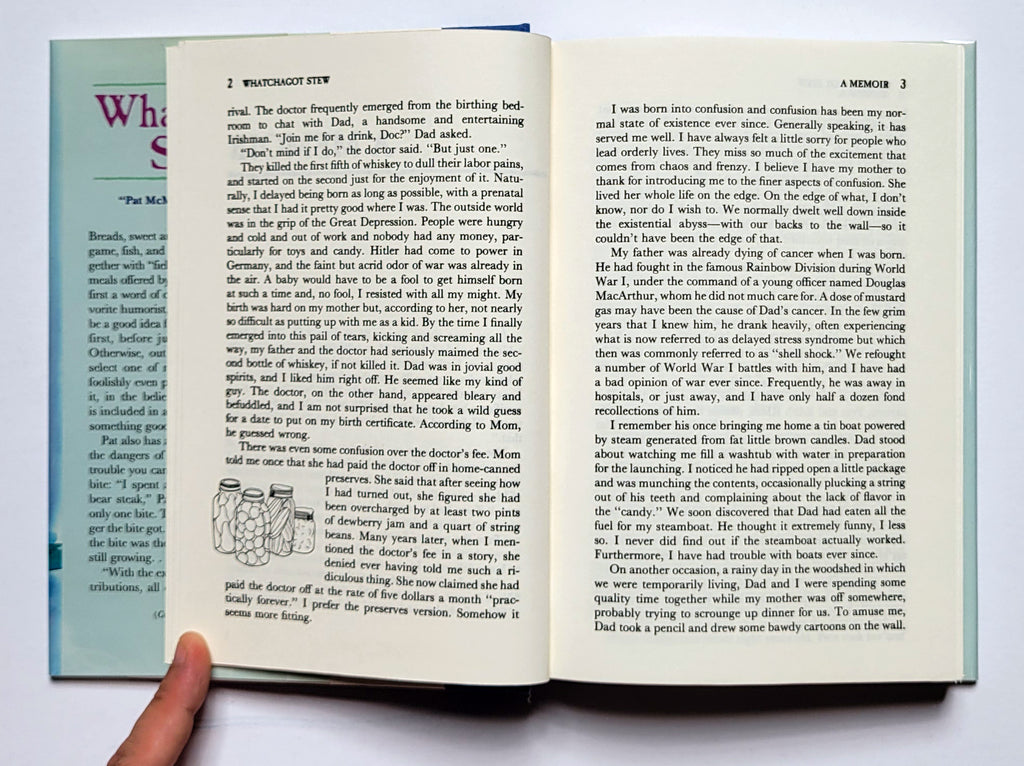 Patrick McManus, Watchagot Stew. Hardbound in glassine-protected dust jacket. NY: Henry Holt, 1989. Xviii, 270 pages. 1st edition. Illustrated, index. A combination cookbook and memoir done with his wife.  Book and dust jacket fine. $8.