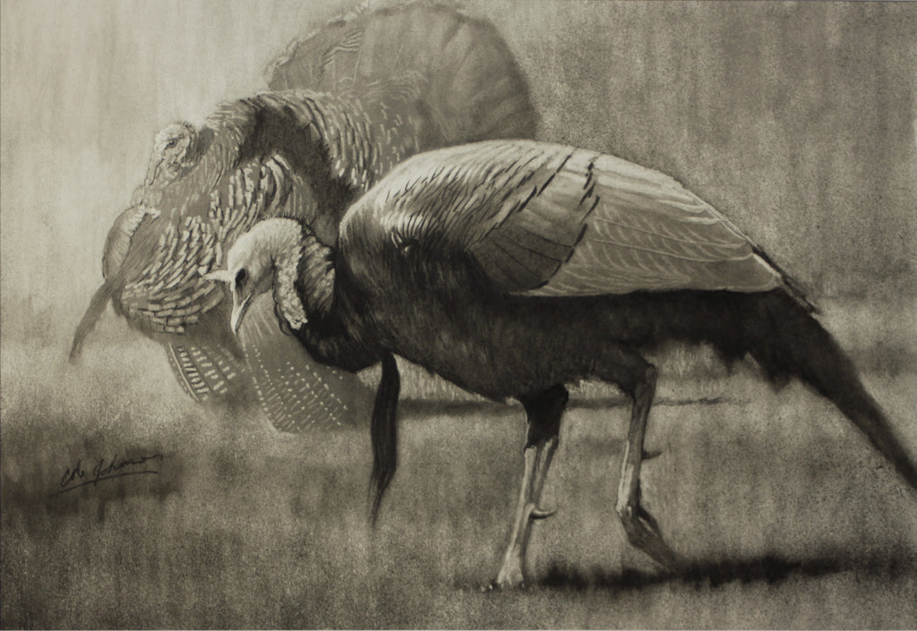 Hunting, fishing, and spending time in; have been the preferred activities most of Johnson’s life. In high school, he added a new activity when he discovered his knack for sketching. This knack led him to pursue a junior college program in Fine Art at the Munson-Williams-Procter Institute of Art and later complete a BFA with a concentration in painting from the State University of New York at Buffalo. Favorite subjects include the species he is intimately acquainted with in the field; the white-tailed deer, trout, turkeys, hunting dogs and waterfowl. Johnson has worked in oils but prefers graphite powder. “The contrast of black and white appeals to me. I enjoy the challenge of making a drawing come to life based solely on tonal value.” says Johnson. Accolades include membership in the prestigious Society of Animal Artists and being chosen Region 1 winner and receiving a Judges Award of Merit from National Arts for the Parks Competition among many others.