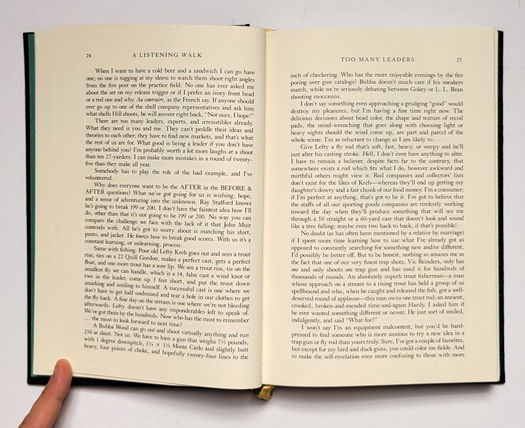 Gene Hill, A Listening Walk. Bonded leather in boards slipcase. Clinton, NJ: Amwell Press, 1985. [x], 230 pages. Signed copy #280 of 1000. Ribbon marker, illustrated. Book very fine and slipcase fine. $60.