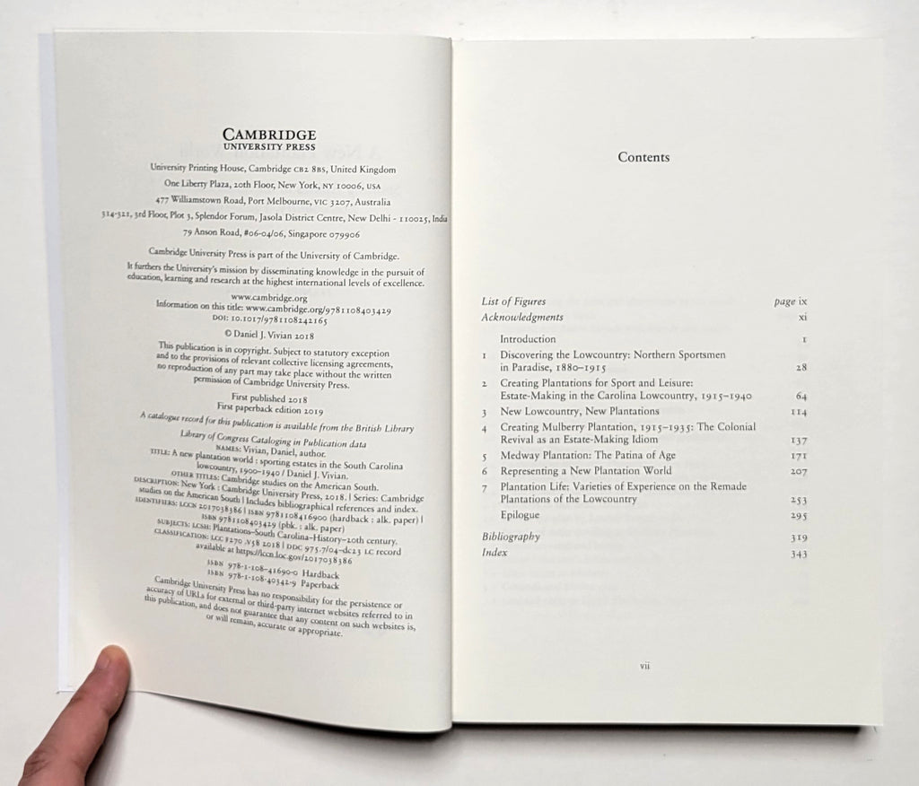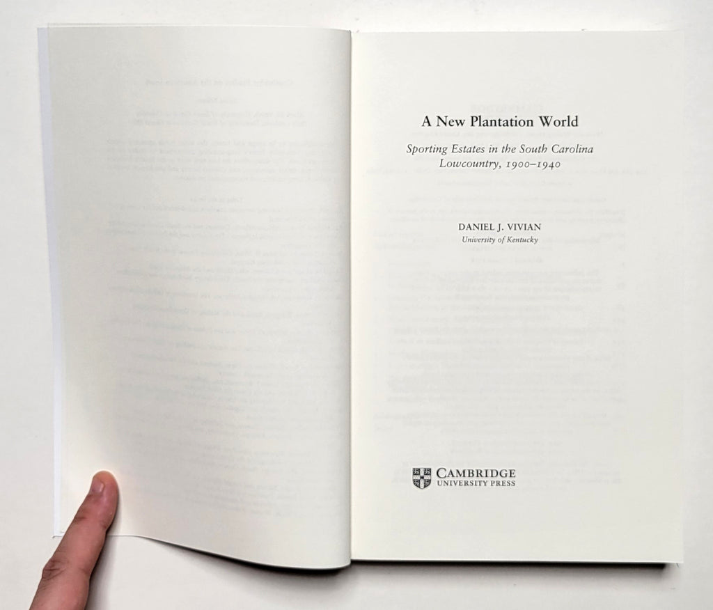 Daniel J. Vivian, A New Plantation World: Sporting Estates in the South Carolina Low Country, 1900-1940. NY: Cambridge University Press, 2018. Paperbound. xiv, 351 pages. Illustrated, bibliography, index. Fine with a press release tipped in. $15