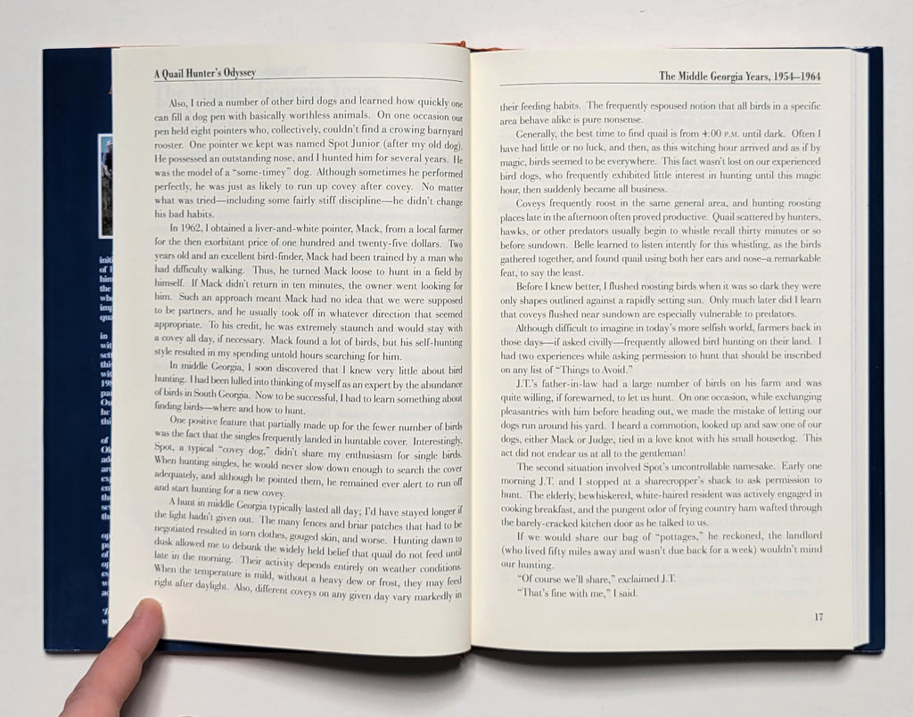 He obtained his first pointer bird dog in 1951, and his long-standing fascination with these quail hunting machines and one setter-has continued until the present. During this period, he has traveled to many venues within the Southeastern United States. In the 1980s, he began a 25 year hunting partnership with Joey O'Bannon and J&R Outfitters in Indiantown, Florida. Currently, he hunts quail with Joey in this venue at least thirty days a year.