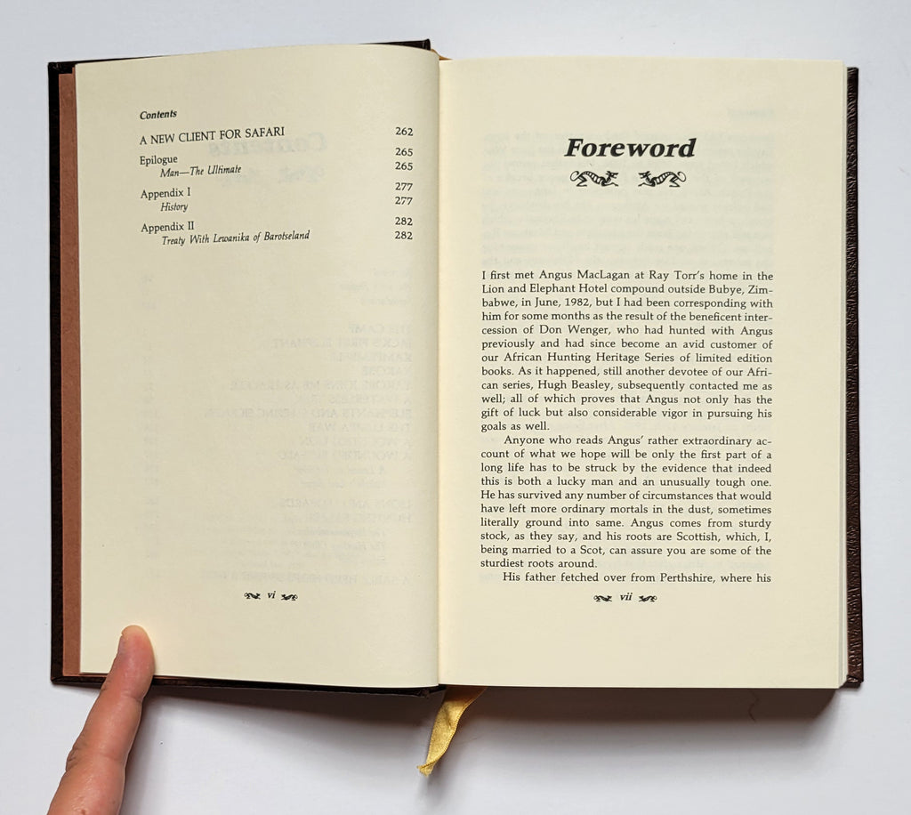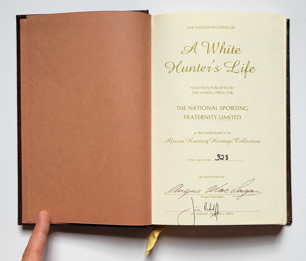 Angus MacLagan, A White Hunter’s Life (Foreword by Jim Rikhoff). Clinton, NJ: Amwell Press, 1983. Hardbound in bonded leather with covered boards slipcase. xii, 283 pages. Ribbon marker, large section of photos. Signed copy (by author and publisher) #183 of an edition of 1000. Book very fine, slipcase good. $110.