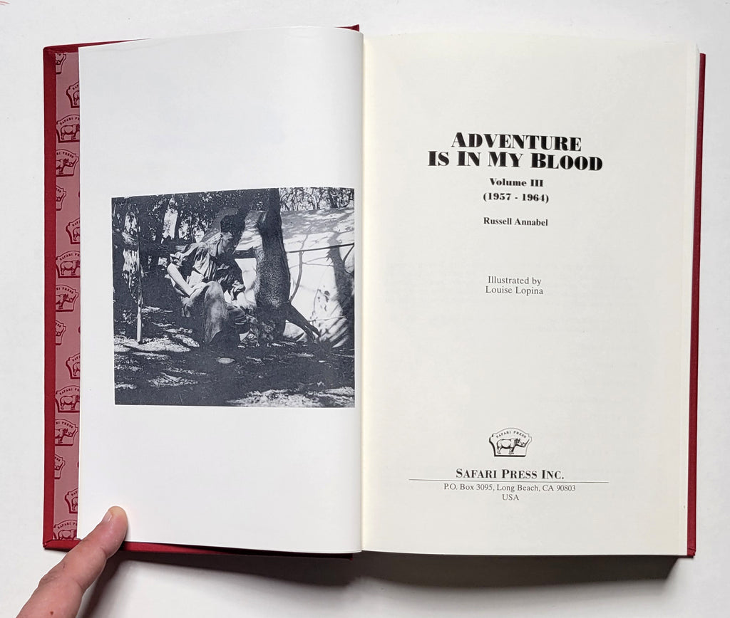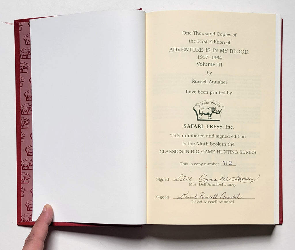 Russell Annabel, Adventure Is in My Blood (with a Foreword by Cliff Cernick). Volume 3 in the Annabel Series. Long Beach, CA: Safari Press, 1997. Hardbound in slipcase. Viii, 384 pages. Illustrated, bibliography (list of original articles from which the book was compiled). Copy #712 of an edition of 1000 signed by the author’s son and daughter. Book and slipcase very fine. $150.
