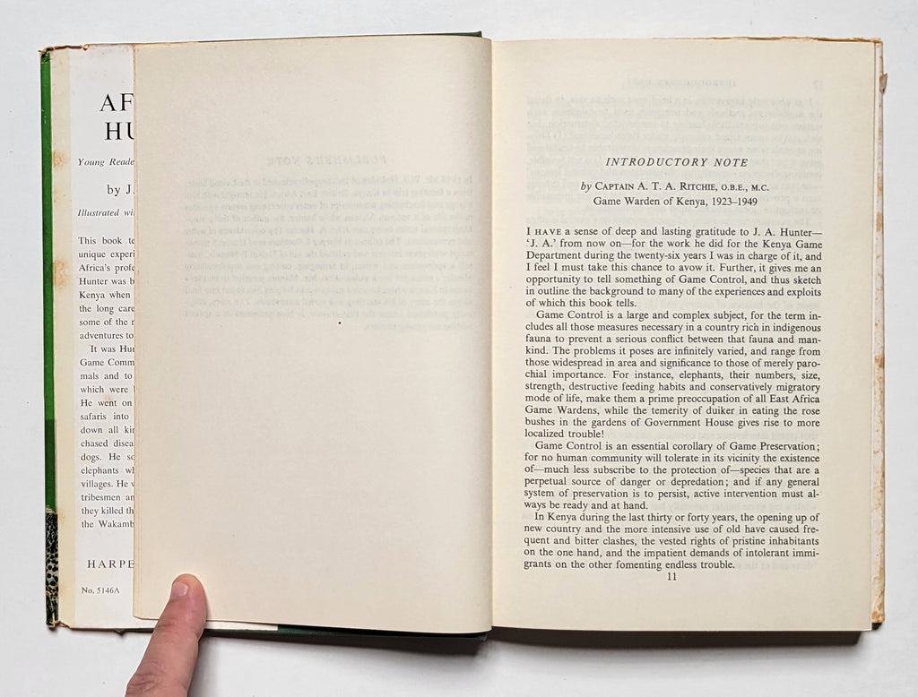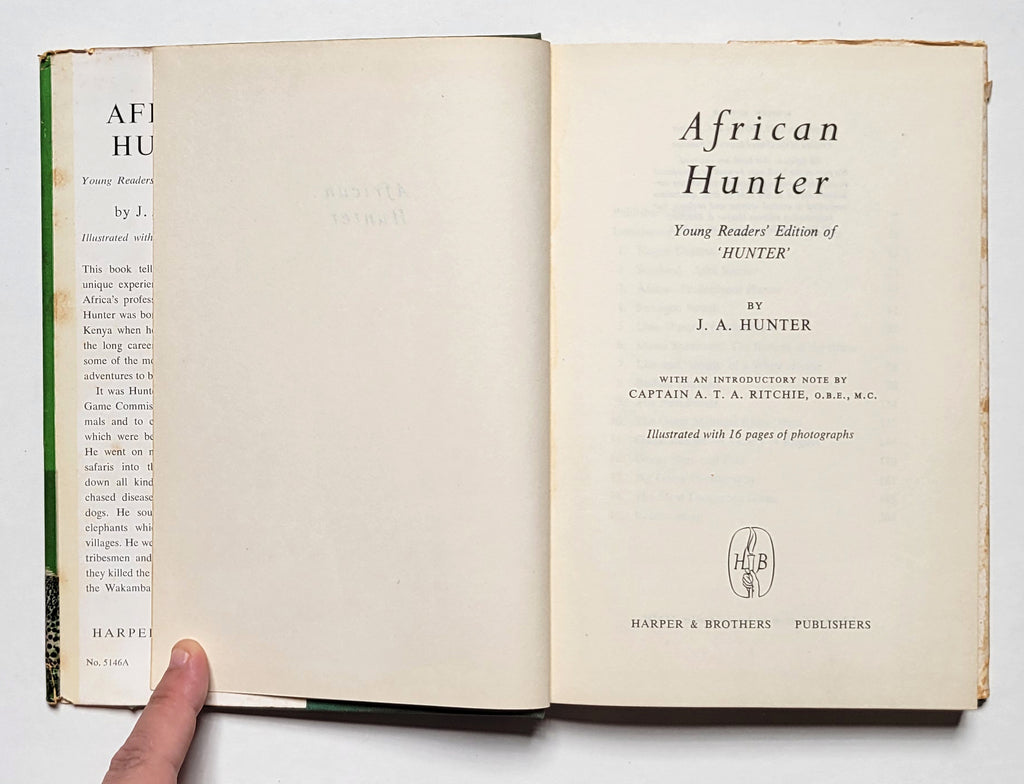 J. A. Hunter, African Hunter. NY: Harper & Brothers, 1954. Hardbound in price-clipped dust jacket. 208 pages. Illustrated. Book and dust jacket fair only (quite a bit of foxing). $7.50.