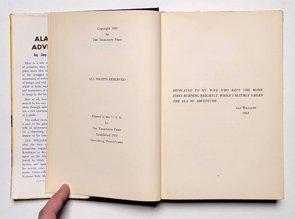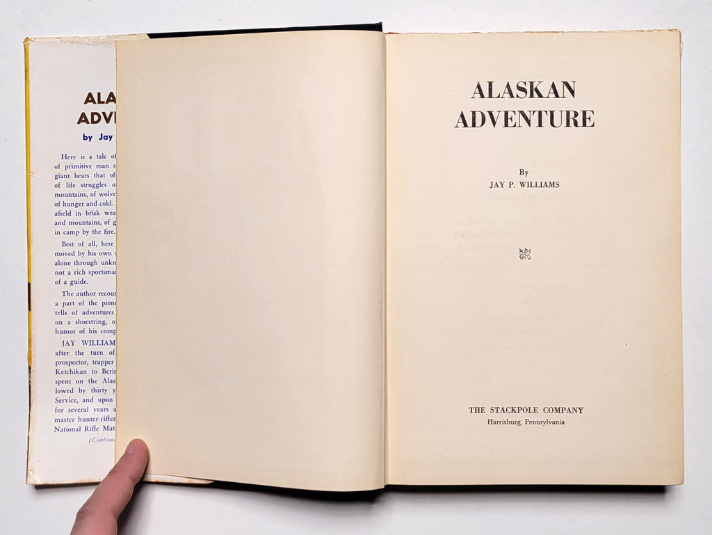 Jay P. Williams, Alaskan Adventure. Harrisburg, PA: Stackpole, 1952. Hardbound in dust jacket. xii, 300 pages. Illustrated. Book very good; price-clipped dust jacket poor. $15.