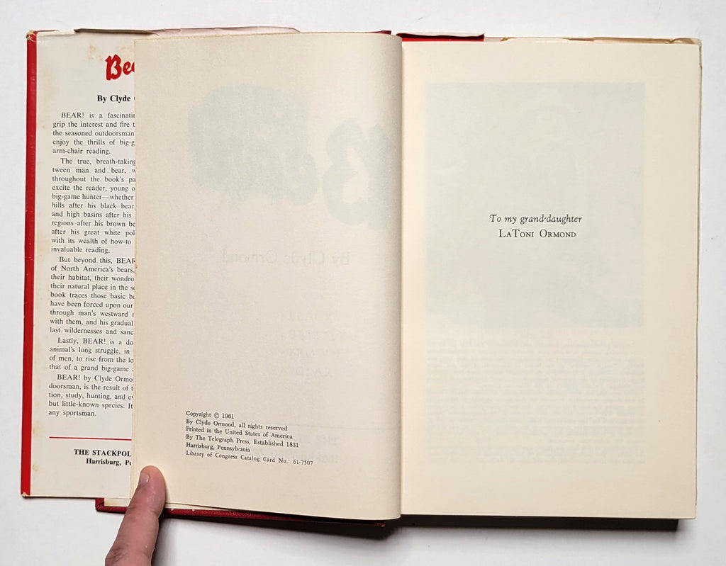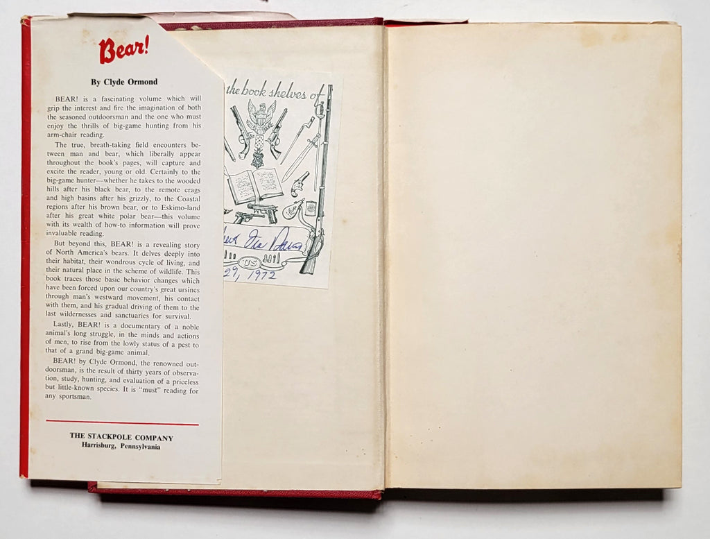 Clyde Ormond, Bear! Harrisburg, PA: Stackpole, 1961. Hardbound in price-clipped dust jacket. [x], 288 pages. Illustrated. Book good; dust jacket poor. $8.