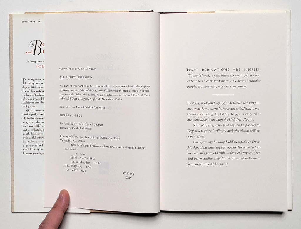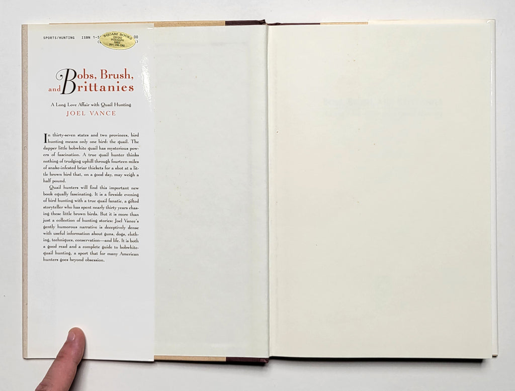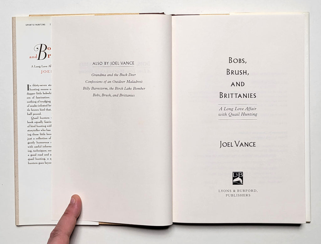 Joel Vance, Bobs, Brush, and Brittanies: A Long Love Affair with Quail Hunting. NY: Lyons & Burford, 1997. Hardbound in dust jacket. 207 pages. Book and dust jacket fine. 1st edition. $12.