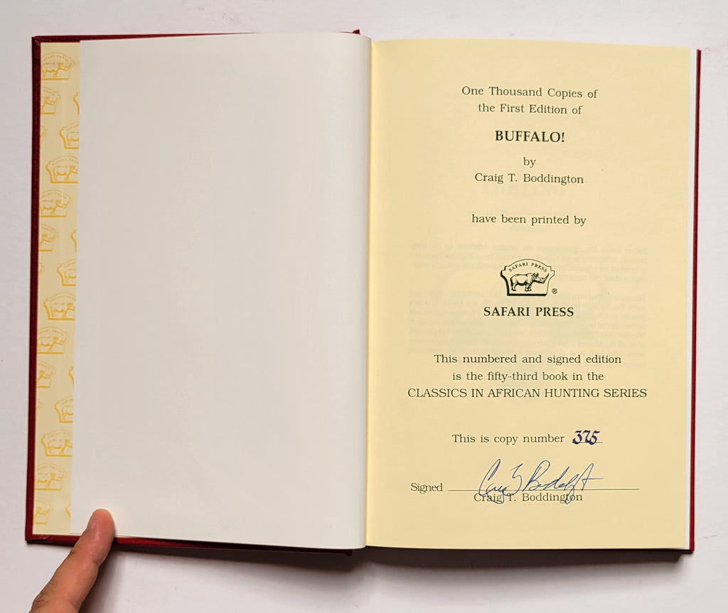 Craig Boddington, Buffalo! San Marino, CA: Safari Press, 2006. Hardbound in covered boards slipcase. viii, 248 pages. Illustrated. Signed copy #375 of an edition of 1000. Book and slipcase very fine. $250.