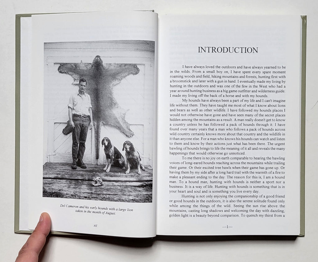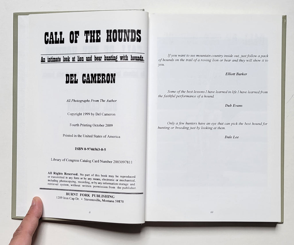 Del Cameron, Call of the Hounds: An Intimate Look and Lion and Bear Hunting with Hounds. Stevensville, MT: Burnt Fork Publishing, 1999. Hardbound in pictorial cover. Xii, 270 pages. Illustrated. Inscribed and signed. Very fine. 1st edition. $50.