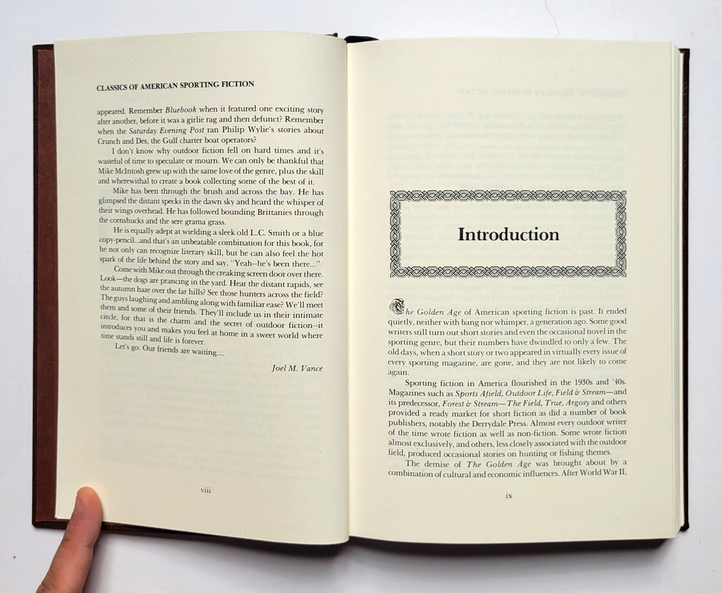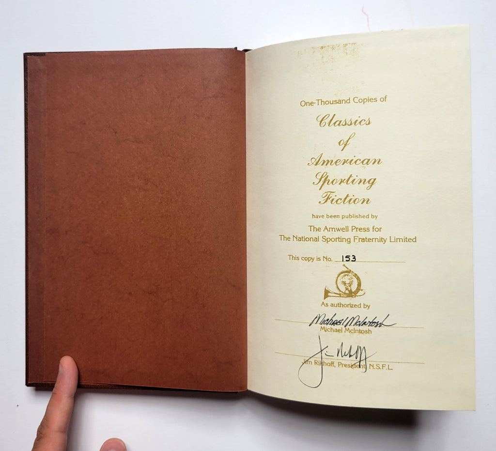 Michael McIntosh (editor), Classics of American Sporting Fiction. Clinton, NJ: Amwell Press, 1984. Hardbound in bonded leather in covered boards slipcase. xvi, 310 pages. Illustrated, ribbon marker. Book very fine and slipcase very fine good. Signed copy #153 of an edition of 1000. $30.