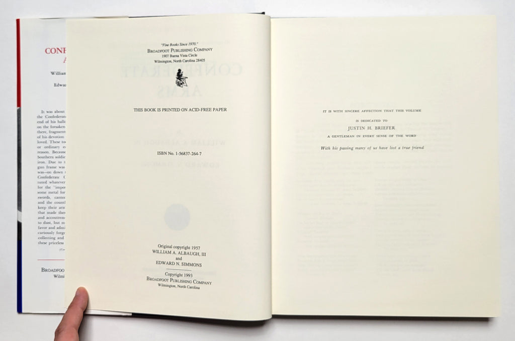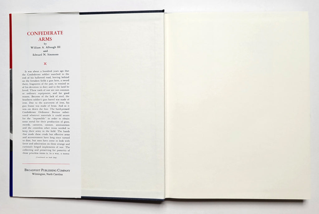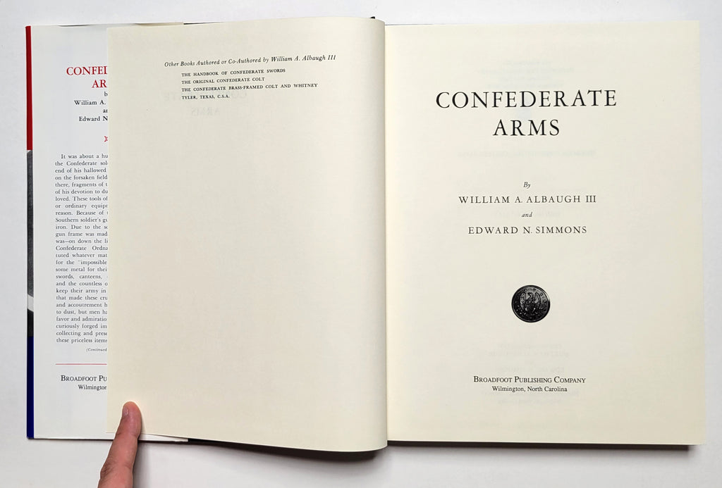 William A. Albaugh, III and Edward N. Simmons, Confederate Arms. Wilmington, NC: Barefoot Publishing Co., 1993. Hardbound with dust jacket (reprint of 1957 original). Large format. Xviii, 278 pages. Illustrated. Fine in good dust jacket. $25.