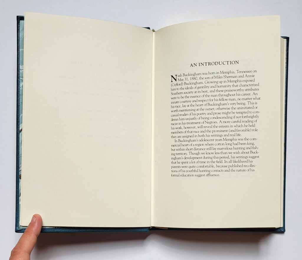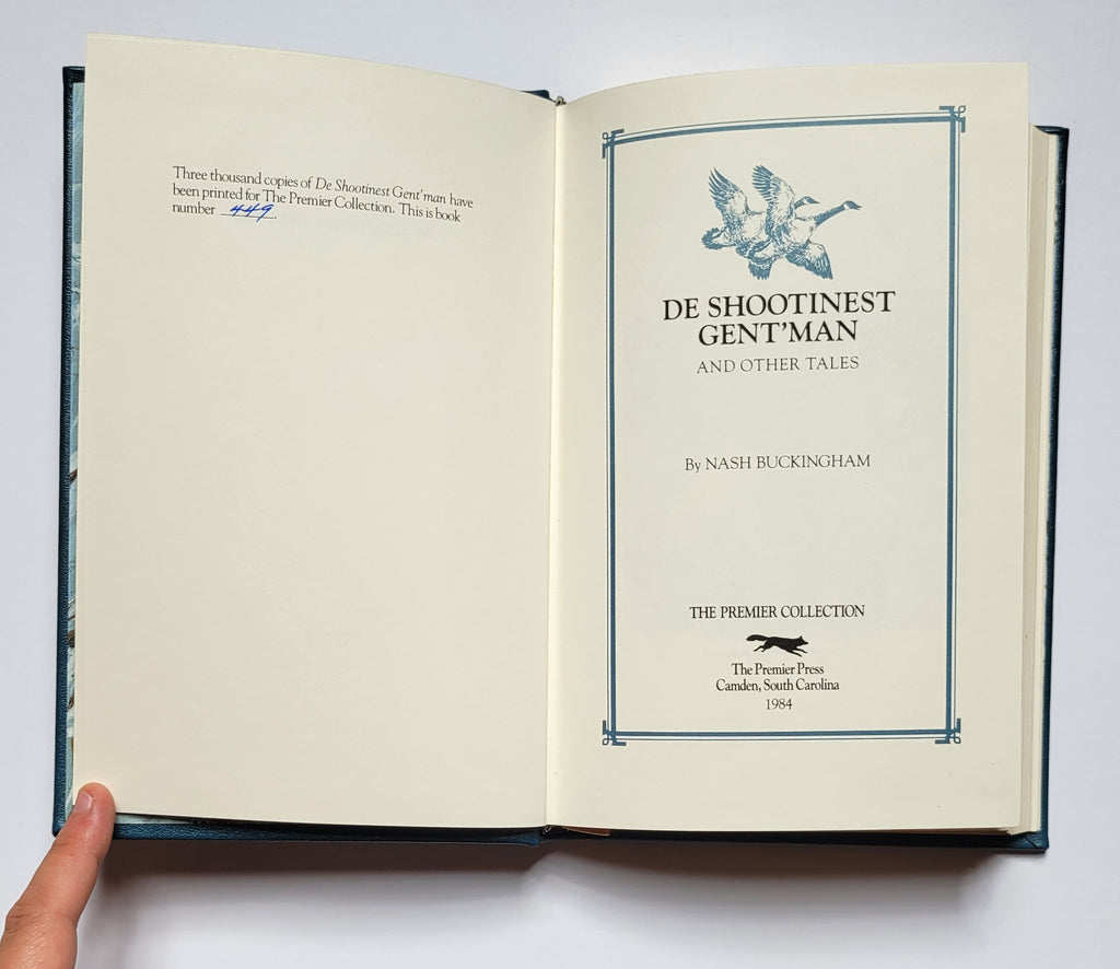 Nash Buckingham, De Shootinest Gent’man and Other Tales (with an Introduction by James A. Casada). Camden, SC: Premier Press, 1994. Hardbound in full leather. [xx], 240 pages. Illustrated, ribbon marker, all edges gilt, ribbon marker, marbled endpapers, raise hubs on spine. Copy #449 of 3000, signed by Casada at end of Introduction. Would be very fine except for some splotching of gilt edging at top. $40.