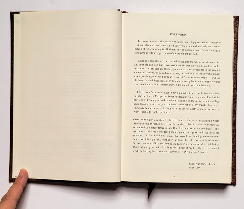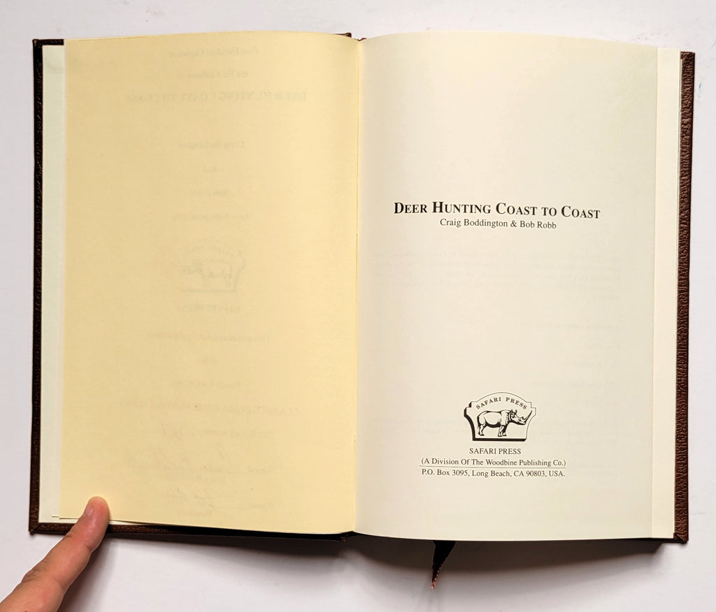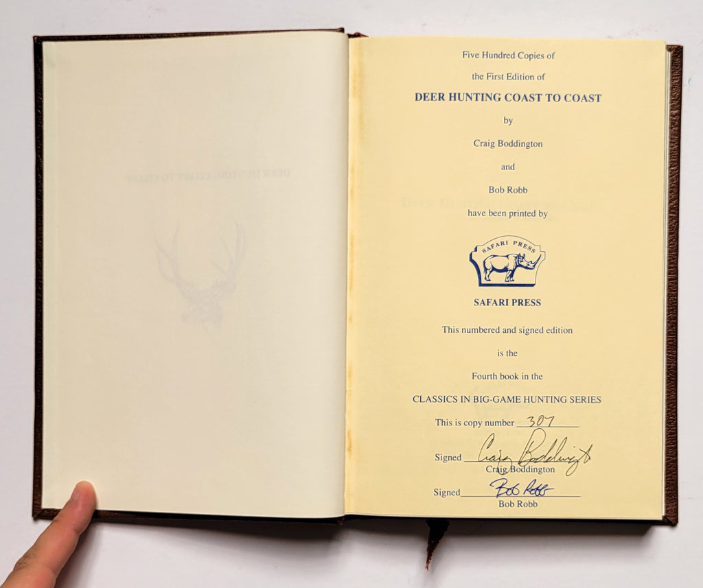 Craig Boddington and Bob Robb, Deer Hunting Coast to Coast. Long Beach, CA: Safari Press, 1989. Hardbound in covered boards slipcase. viii, 246 pages. Illustrated, ribbon marker. Signed copy #307 of an edition of 500. Book and slipcase fine. $175.