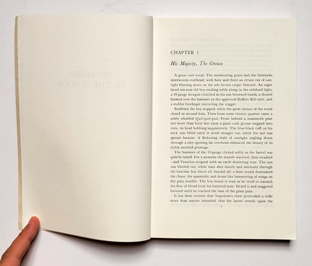 Burton L. Spiller, Drummer in the Woods. Paperbound (a volume in “Classics of American Sport” series). Harrisburg, PA: Stackpole, 1990. Xii, 239 pages. Illustrated. Very good. $8.