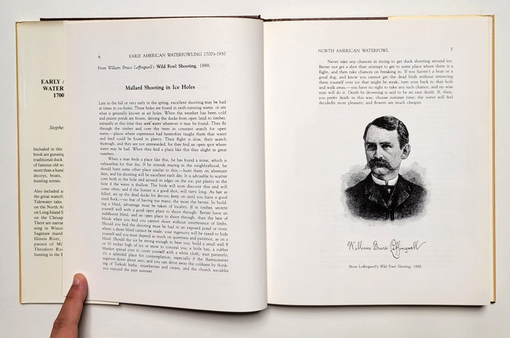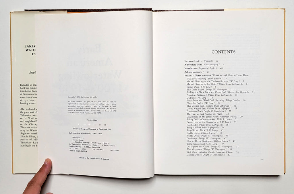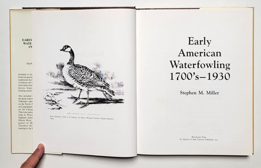 Stephen M. Miller, Early American Waterfowling, 1700’s-1930. Piscataway, NY: Winchester Press, 1986. Later printing. Hardbound in price-clipped dust jacket. xvi, 279 pages. Illustrated, bibliography. Book good; dj fair. $25.